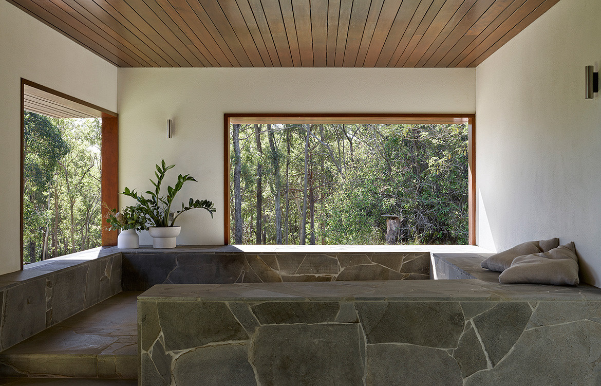 Hogg & Lamb located a supplier on the Sunshine Coast who was able to provide the material in a colour that matched the site. The wall continues beyond the building to recede gently into the landscape. As a result the wall, which is scaled to mirror that of the site, feels like it is an extension of the land and its bushy flora.