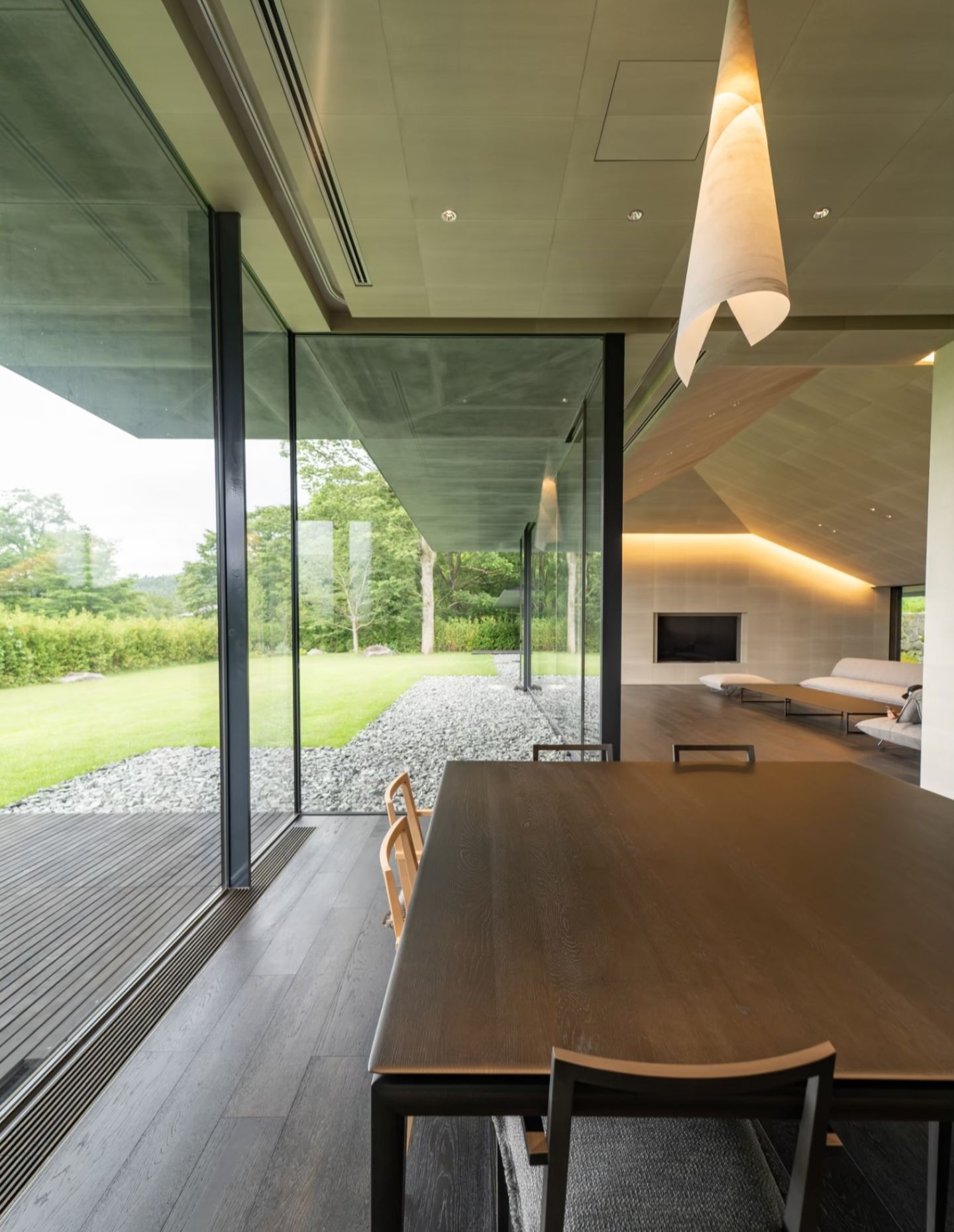 The rectangular format of the house sees all spaces positioned to face Mount Fuji through floor-to-ceiling glass windows that evoke shakkei, a Japanese traditional architectural term meaning ‘borrowed scenery’ (to visually incorporate an adjacent or distant exterior view into the interior).