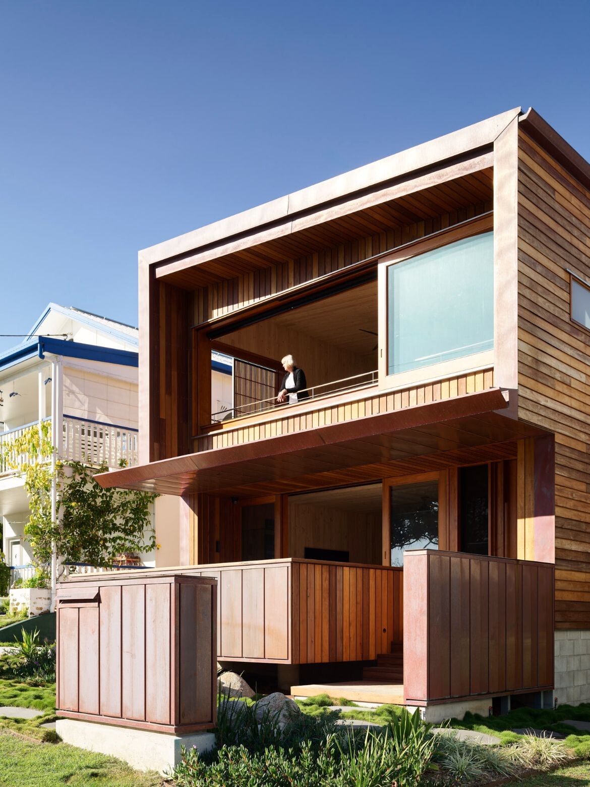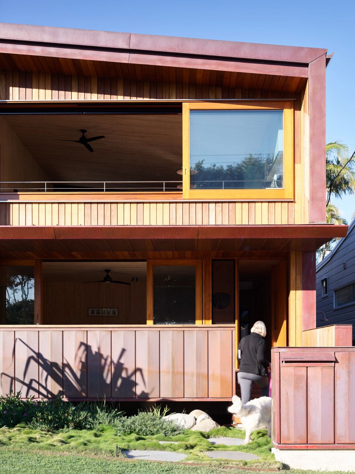 The design illustrates how using one broad material, timber, does not preclude a sense of variety. Member sizes differ from light wall panels to finely detailed latticework, with the architects choosing to add copper for certain elements. Taken together, these materials have been selected with durability and – given the beachside location – capacity for weathering in mind.