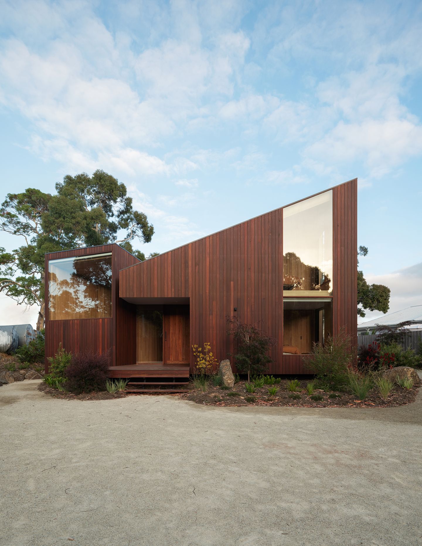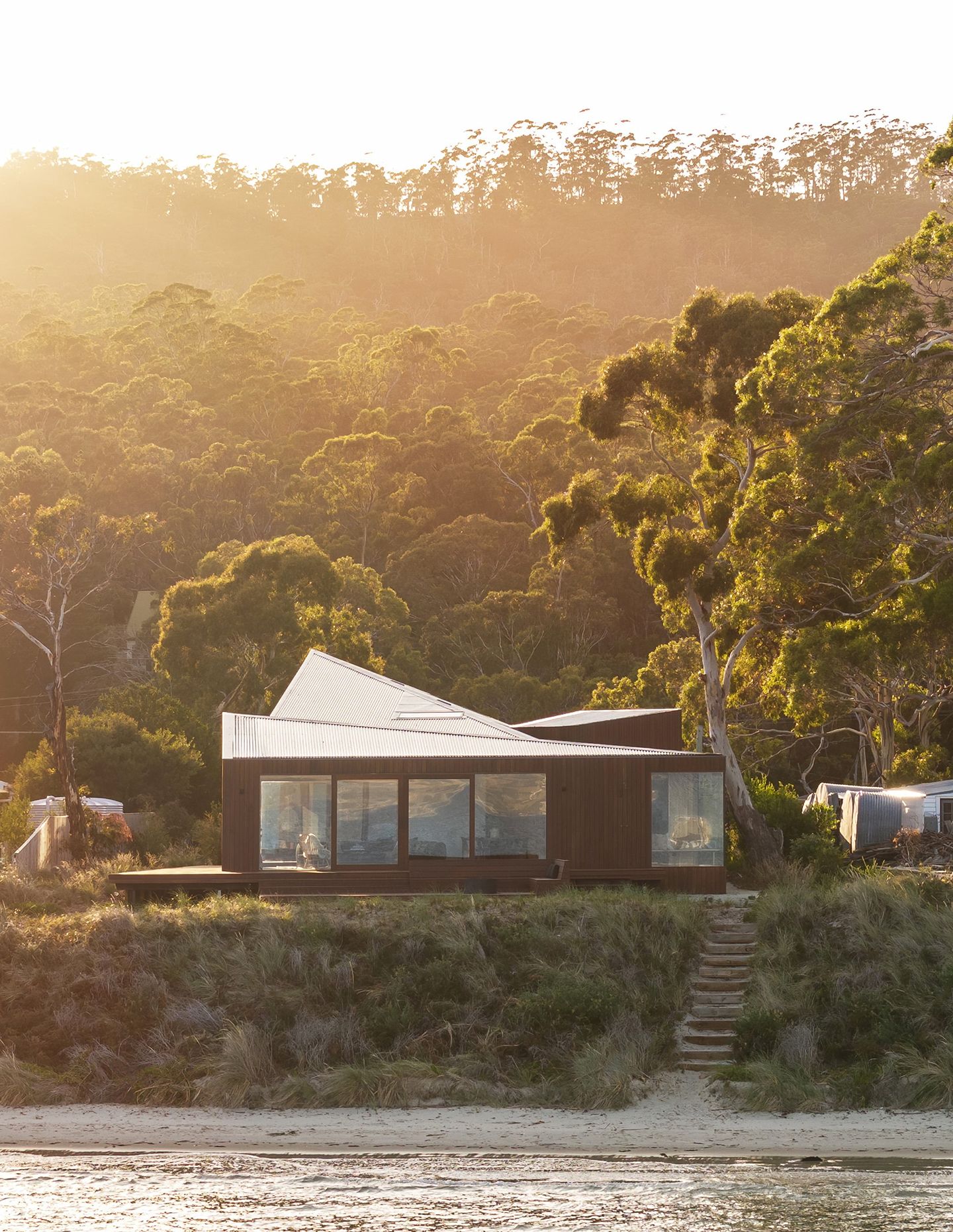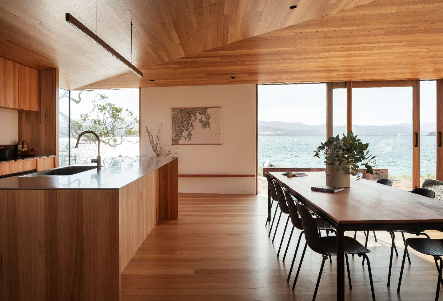 In Tasmania, where external conditions can change in a minute, an angular composition maximises opportunities for both time outside and light through the beachside home. The courtyard is protected from the westerly wind, and even inside at the dining table, the family feel immersed in the outside.