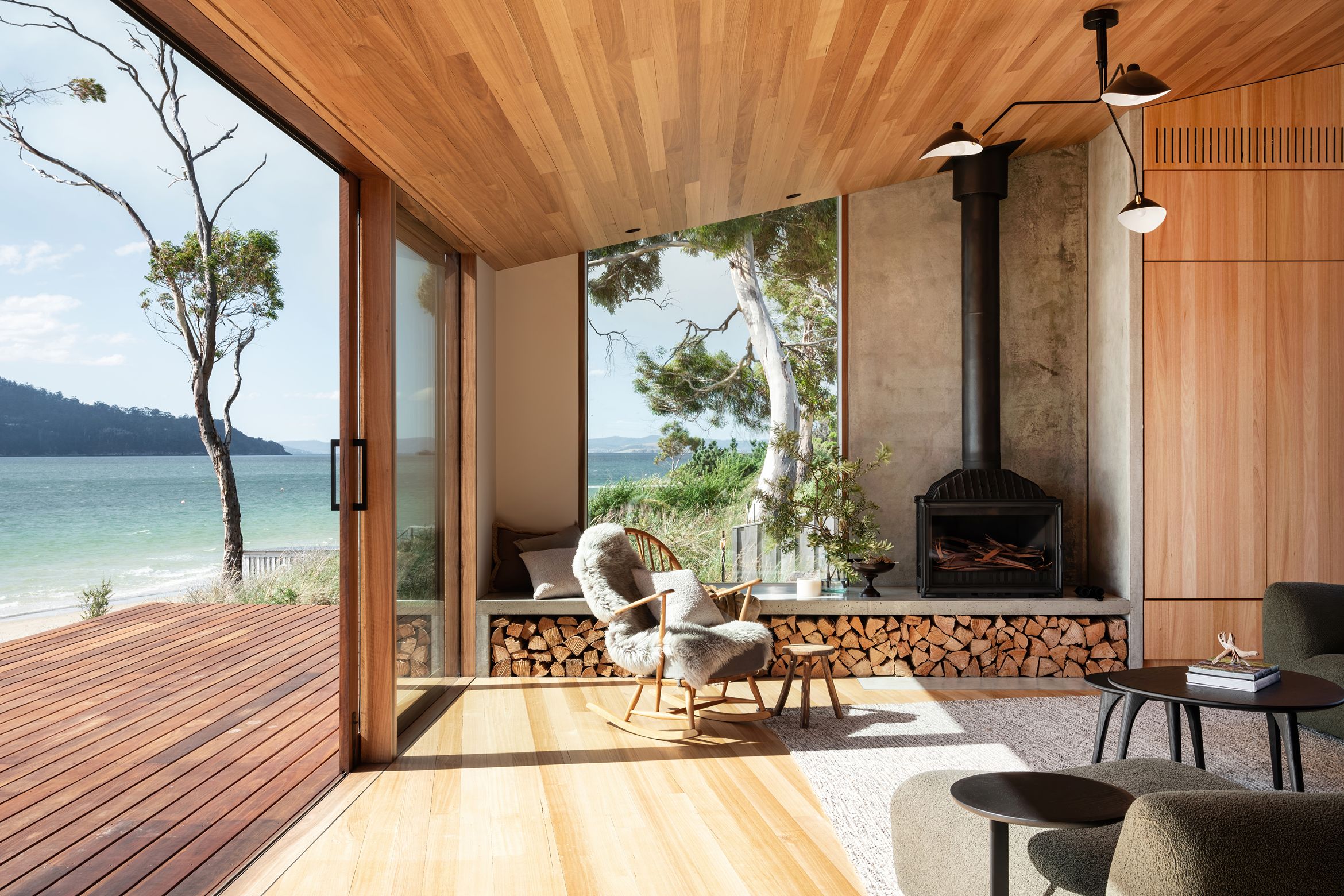 On the exterior, spotted gum cladding, decking, and windows provide a sense of continuity (and meet bushfire standards), extending into the interiors where Tasmanian oak walls, ceiling and floors meet. On the northern living room wall, off-form concrete panels anchor the home in the views and around the cast-iron fireplace. In celebration of its surrounding environment, custom Tasmanian oak joinery is featured throughout the kitchen, bathrooms, and bedrooms – including the bunk beds, which reach up into the angled ceiling cavity – evocative of a luxury camping cabin, such as the ones seen on the nearby iconic hiking tracks.