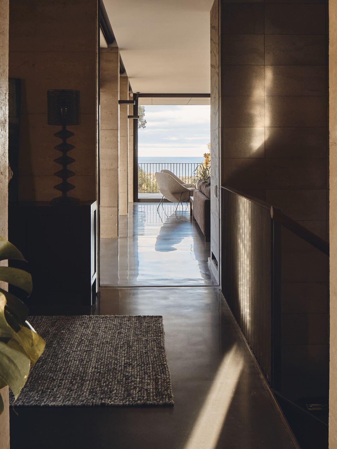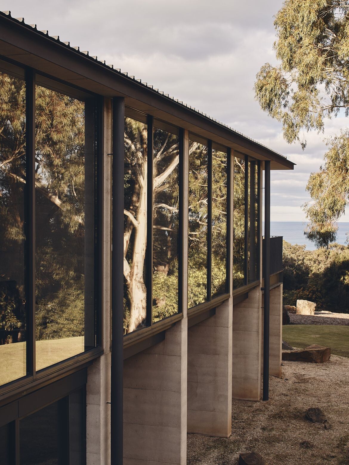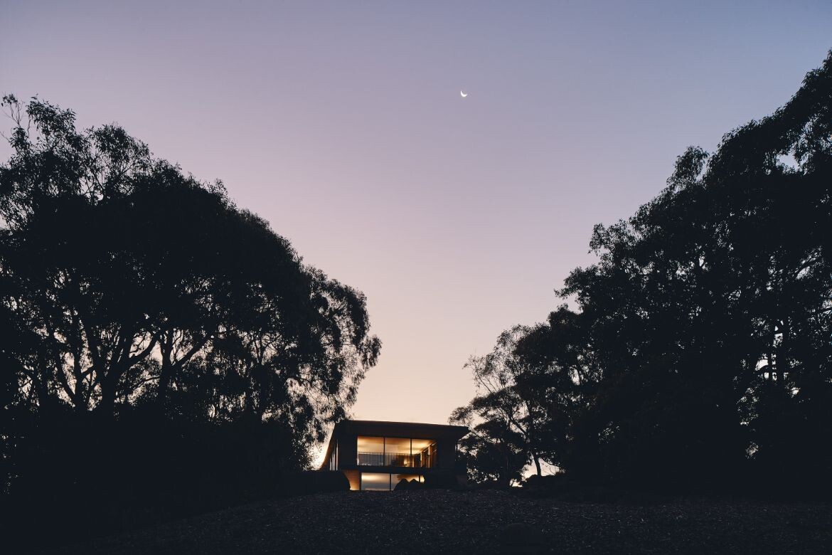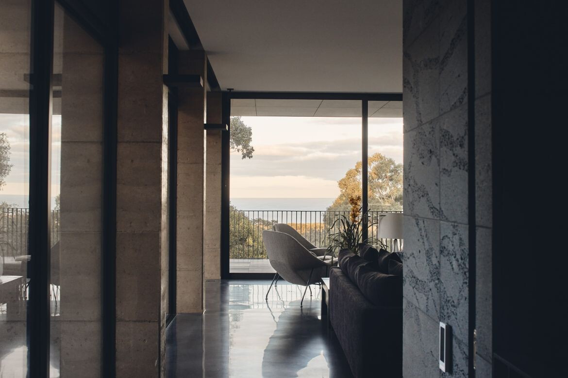 The house overlooks the Aireys Inlet and is aptly named after it, leveraging its location to stage the uninterrupted beauty of the adjacent scenery. The building’s form is defined by the implementation of recessed fixed glass and rammed earth fin walls, which craft an alternating sequence of framed views and transparent vistas of the horizon. This play of open views fosters a dynamic interaction with the exterior environment.