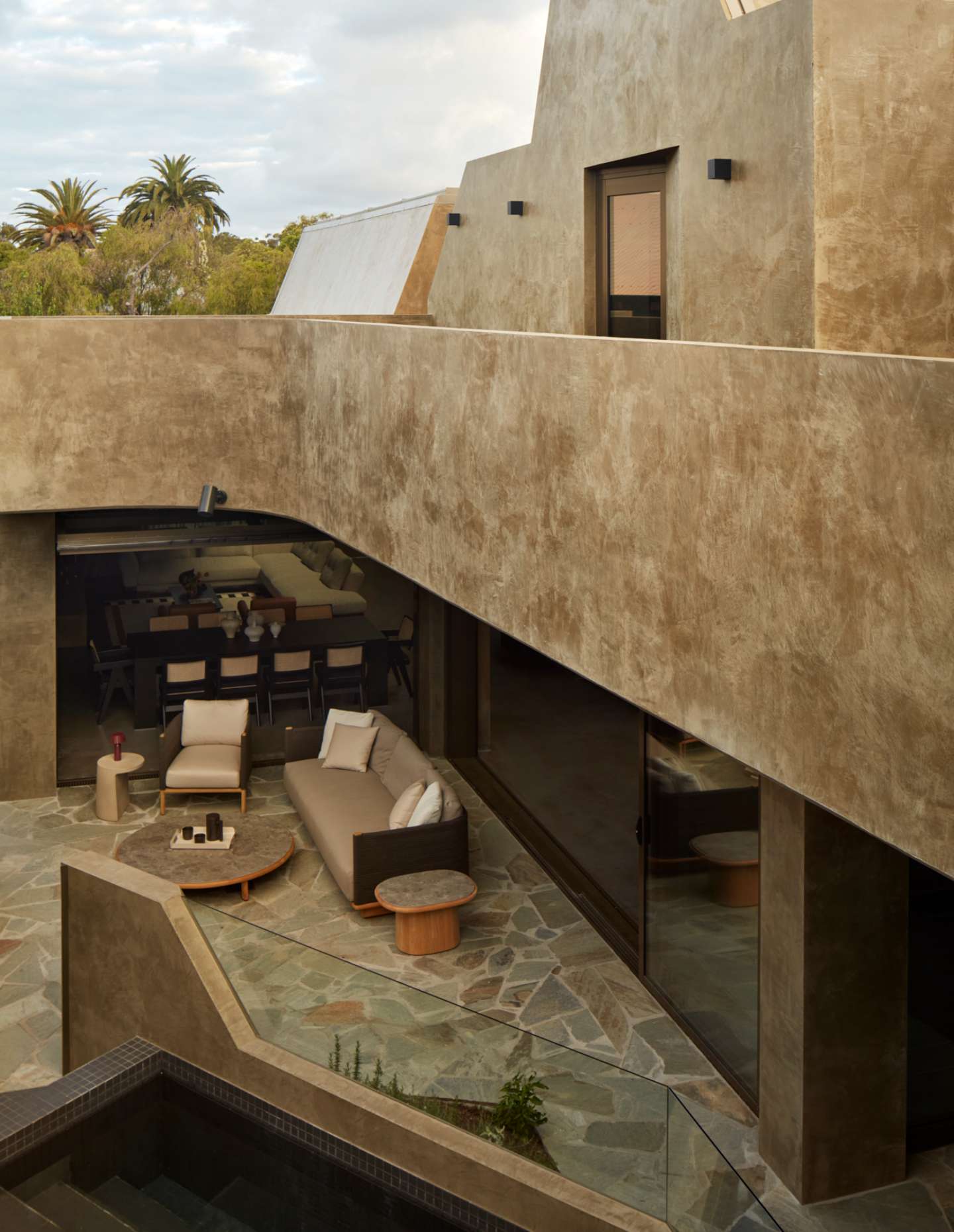 Responding to the local vernacular with an abstract hand, the home’s sculptural silhouette marks its presence amid a varied streetscape, referencing the proportions, pitched volumes and generous setbacks of the suburb’s archetypal character homes. A palette of earthy render and aluminium detailing lends rawness to the architecture while obscuring boundaries between the landscape, interior and exterior, resulting in an immersive environment that elevates the client’s everyday living rituals.