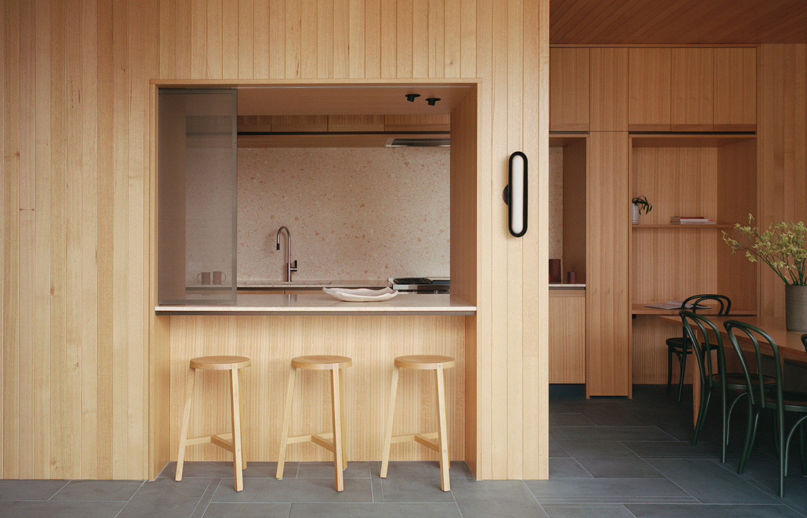 One of the most innovative parts of this home is the kitchen, with its sliding doors allowing it to feel integral to the garden. Lined in timber, with a moveable mesh screen over the island bench, it exemplifies the bespoke nature of this design. “Our client didn’t want to be continually cooking in the kitchen, preparing snacks in between meals. The screen was her way of saying ‘The kitchen is now closed!’’’ says Mel, who provided a similar mesh veil to a side window in the kitchen, elevated above the pavement. “It’s lovely to be able to feel part of the streetscape, but still maintain a certain level of privacy.”
