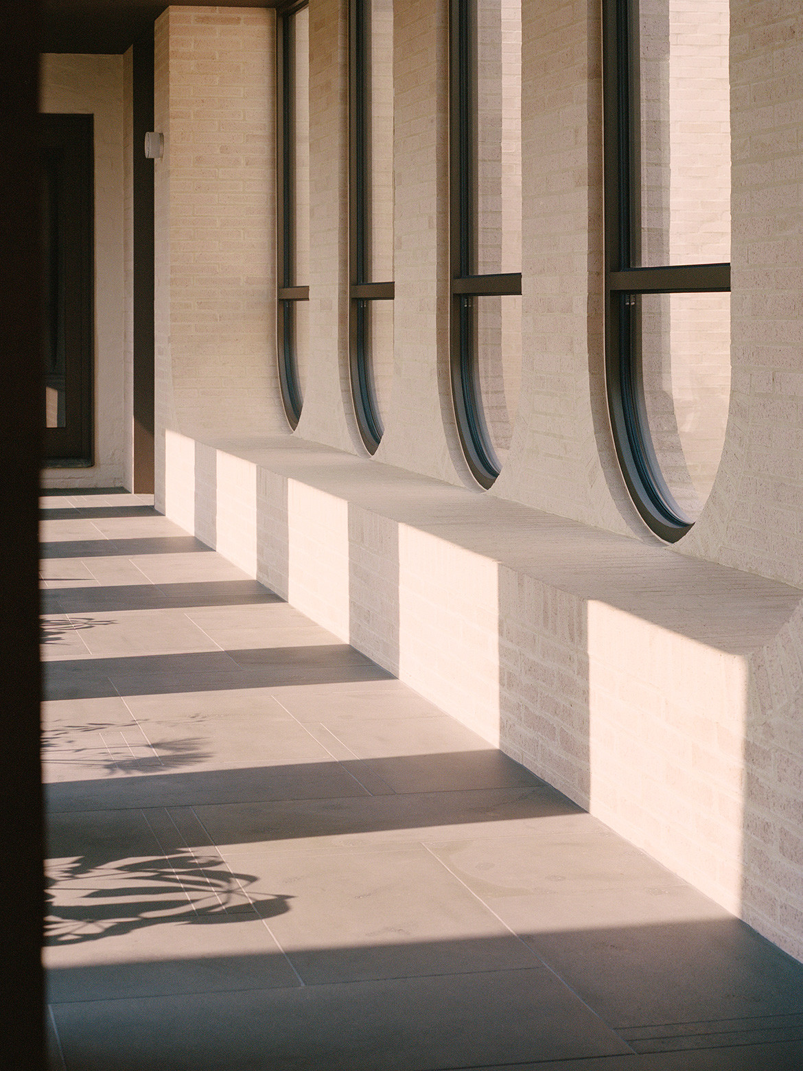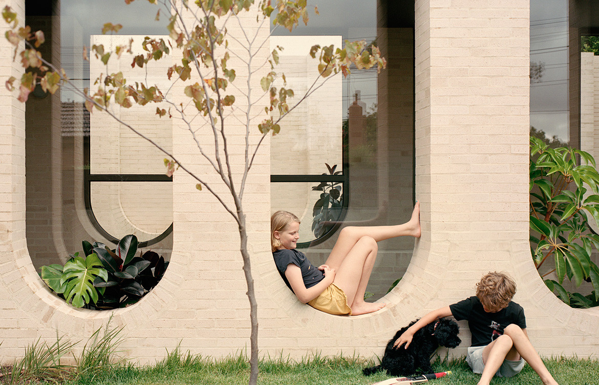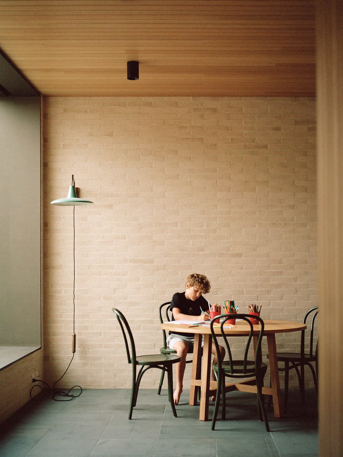 Studio Bright restored the original Edwardian red brick home, removing the 1980s “faux-Edwardian addition”, together with the garage and sheds along the property’s southern boundary. The house’s flimsy aluminium windows were also removed, along with the unusual decorative choices from the 1950s. “We wanted to free up the back garden (orientated to the north) as well as allow the original home to breathe,” says Mel, who aligned the new covered link with a swimming pool to the east of the original corridor. This link, with its inverted brick arches, not only provides seating for the children and their friends but also a place to dive into the pool (in the form of built-in alcoves) from the other side.
