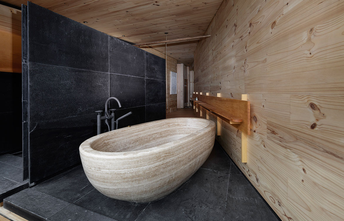 James has been fastidious in his attention not just to detail, but to the right detail. “Every bracket and screw,” he says, “is used to inform the overall aesthetic of the home with materials selected to develop a patina of use and character with time.” Hence, the tapware is from New York, the hydronic heating from the Czech Republic, the limestone flooring from Germany (cut and processed in Hong Kong), the travertine bath is from New Zealand, the superbly honed concrete vanities from the Gold Coast, and steel window frames and cladding from Austria – plus a host of sustainable features.