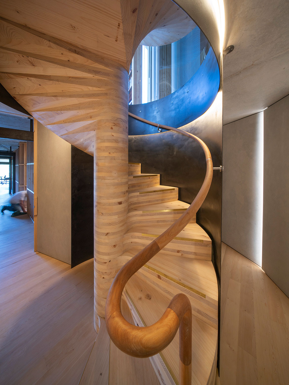 This is a house made primarily from cross-laminated timber (CLT), manufactured and processed in New Zealand. This includes structural frames and a boldly cantilevered volume forming one of the two main living spaces. James grew up and trained in Tasmania where he formed a love of local timbers. Hence, the timber linings in the house are Huon Pine, Blackwood and Celery Top Pine – the latter two being sourced from Hydrowood which recovers timber from Tasmania’s drowned forests. Collecting the Tasmanian timber took ten years, while the Hydrowood required ordering whole trees up to two years ahead in order to allow for drying and processing.