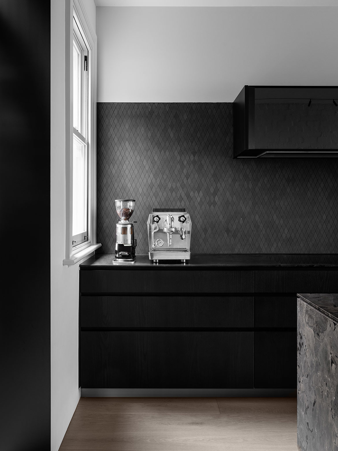 The kitchen makes this point well with a monolithic stone island in a leathered black and bronze Magnesia stone from Artedomus, clipped at each end to deliver geometric interest. The under-counter and splashback are both finished with a quartz limestone diamond tile in shades of black, while the Poliform cabinetry in dark timber provides another surface pattern.