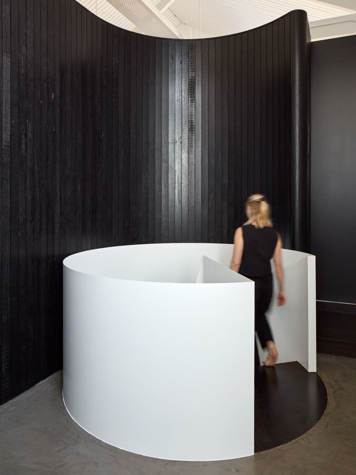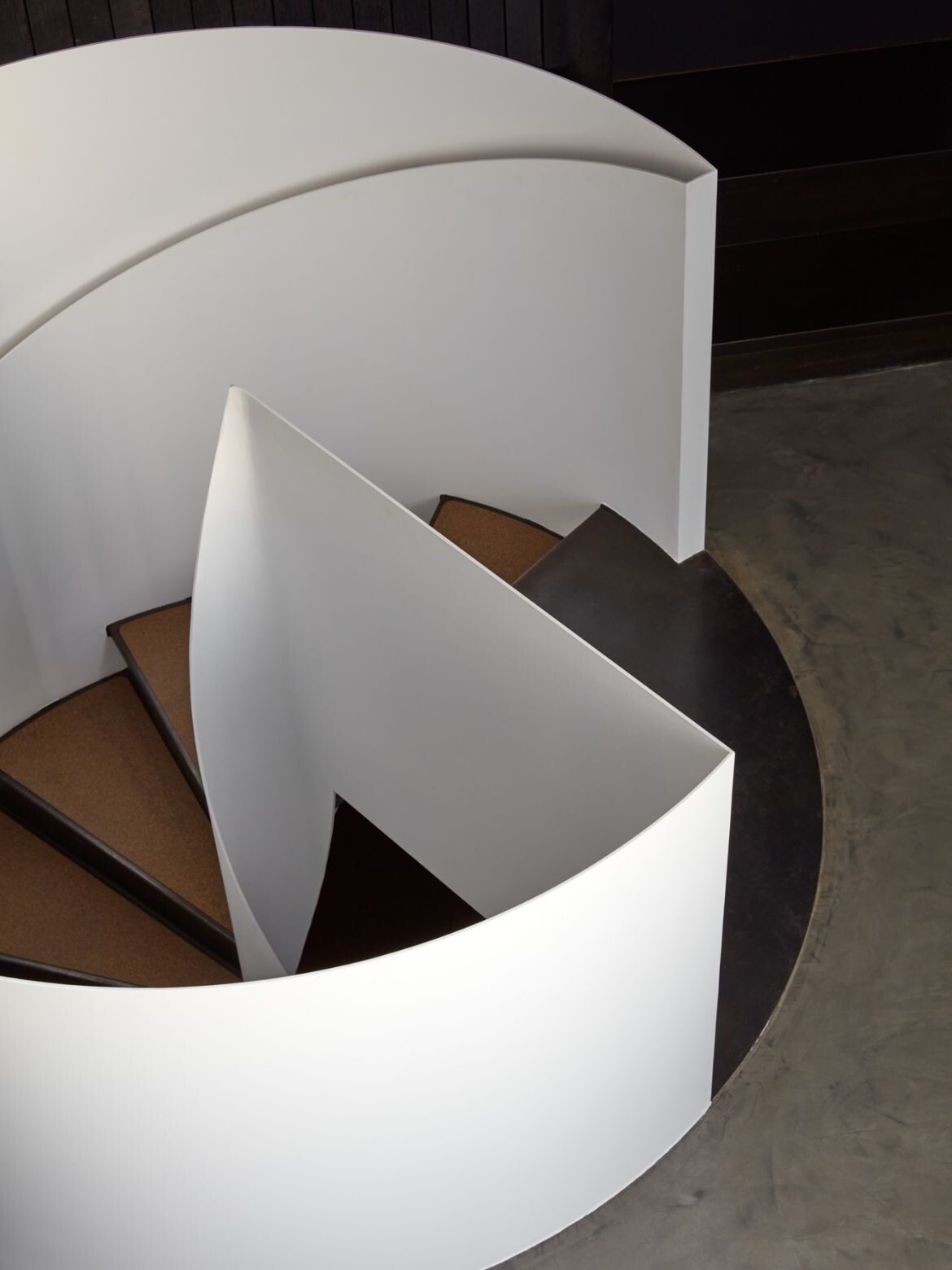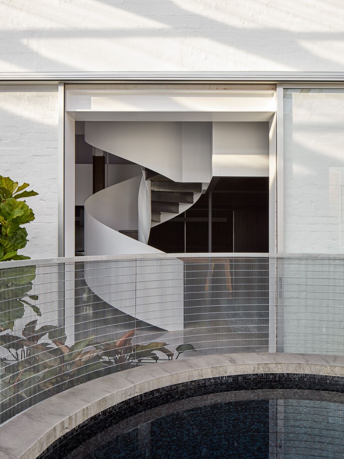 There is a logic applied to the planning that works with the constraints, such as where to arrive and descend. “The spiral gave us the best outcome in terms of functional requirements, but then it also influences other things, like the circular swimming pool and other circular elements that were spun off the spiral stair,” shares Walker.