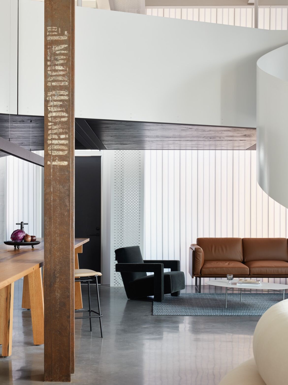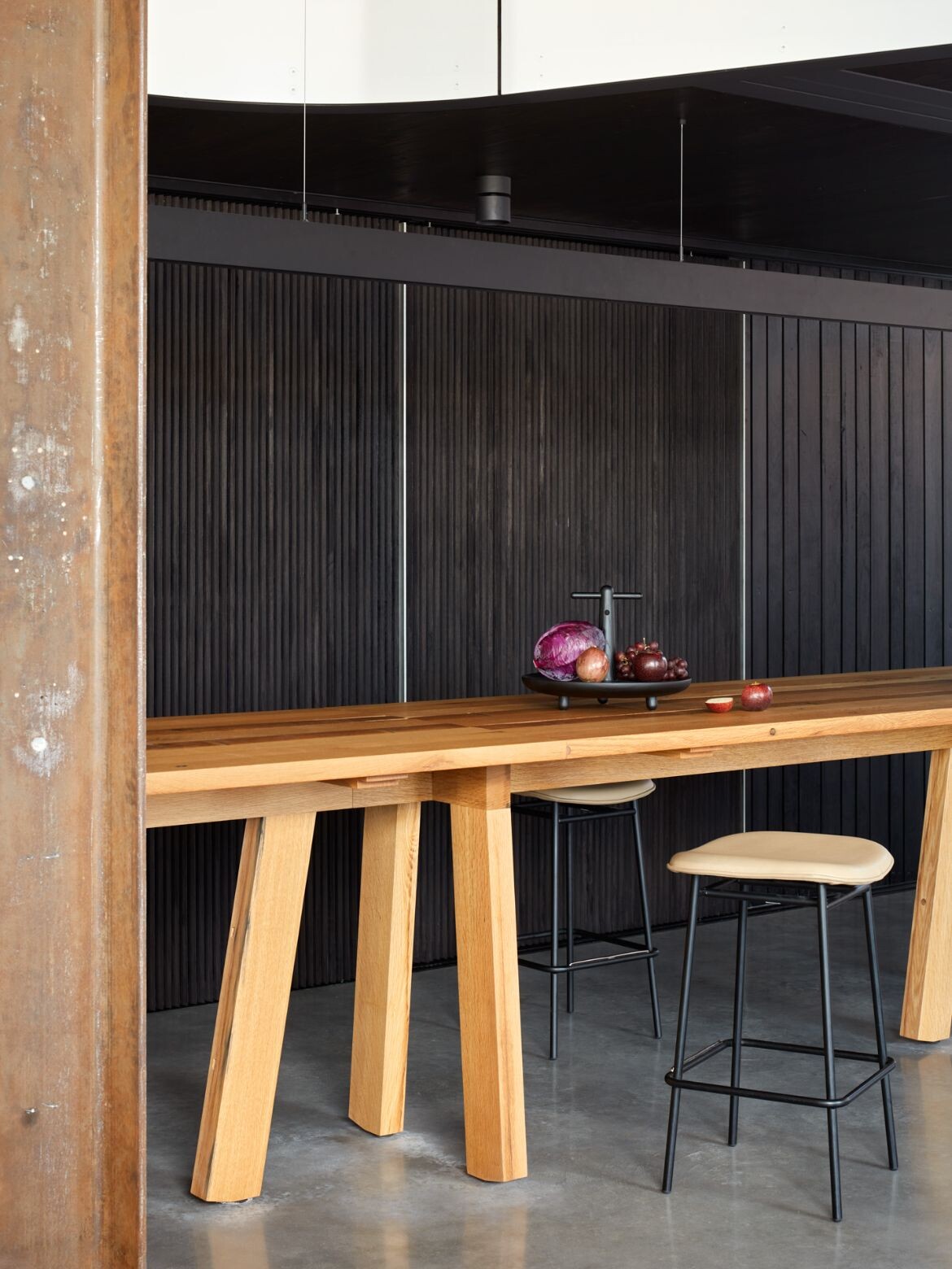 Utilising both the horizontal and vertical planes that an industrial building can afford, the lower level is where life is acted out. “The ground floor is organised around a linear core that consolidates all of the services. There’s a kitchen, pantry, laundry, powder room, and all of the vertical plumbing and electrical are centralised into this core,” explains Walker.