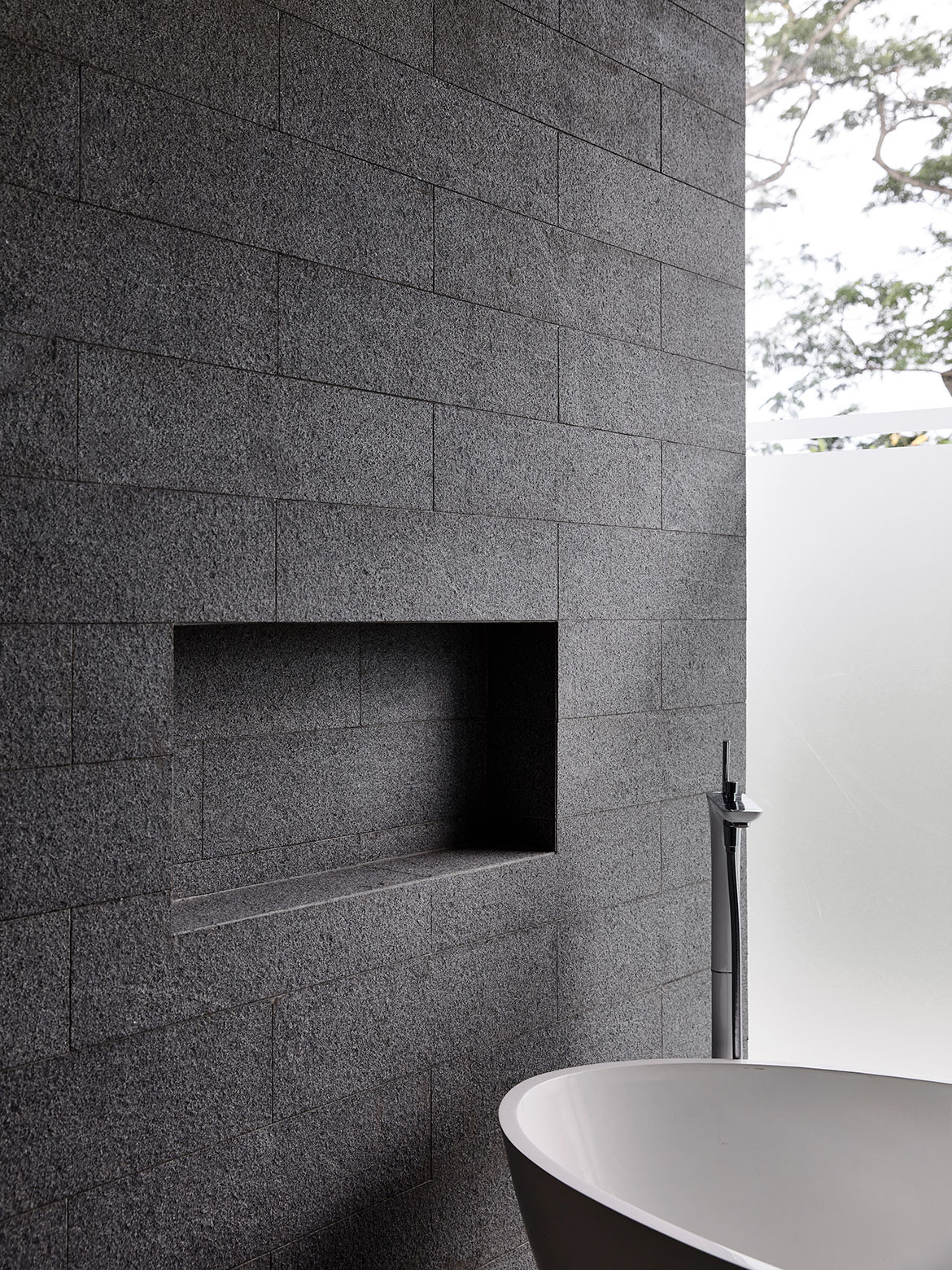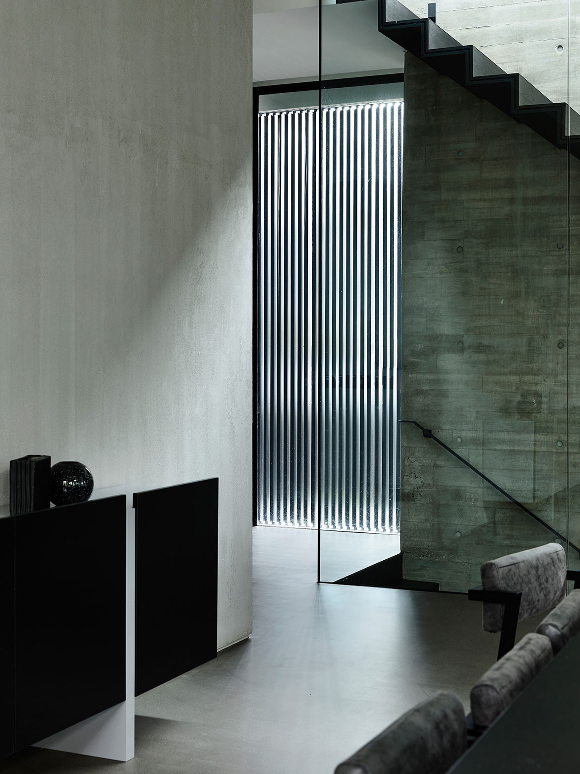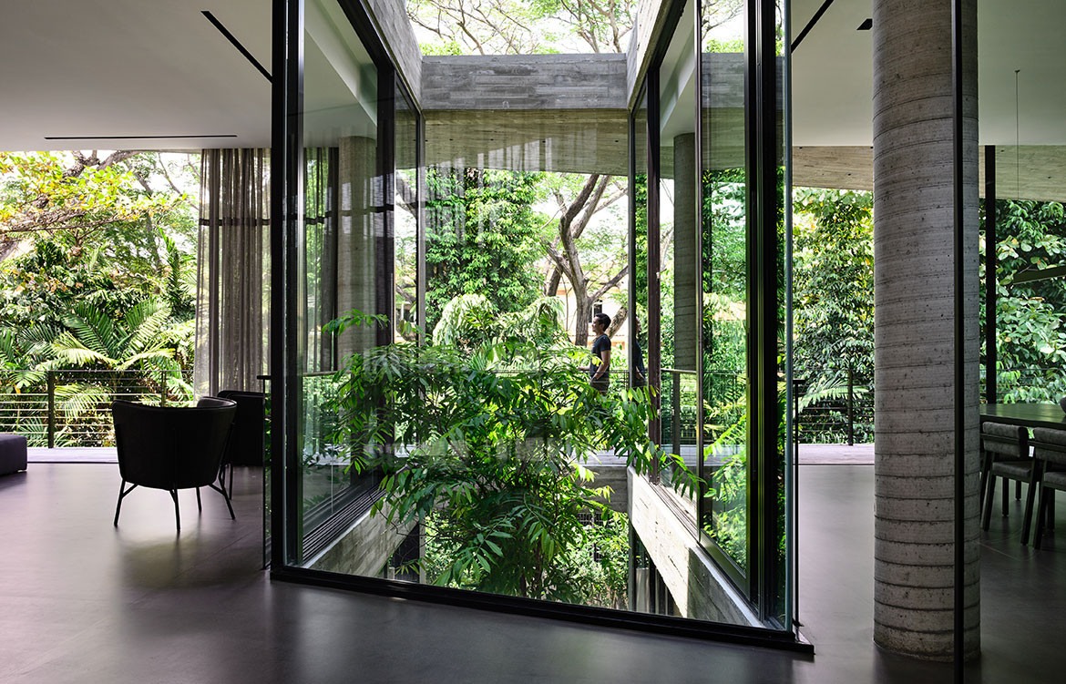 Not surprisingly, visual porosity towards the trees behind was a major driving force governing the design. Almost without exception, all the major rooms and even beds are orientated towards the trees. Views are framed by frameless glass, or else framed glass windows are slid open for direct biophilic connection. A vertical courtyard links all three floors to a dry garden at the basement, and it is positioned to be the first sight that greets the visitor upon entering the front door. There is everywhere a Zen touch that imbues the design, one that downplays the architecture so that nature can be its focus.