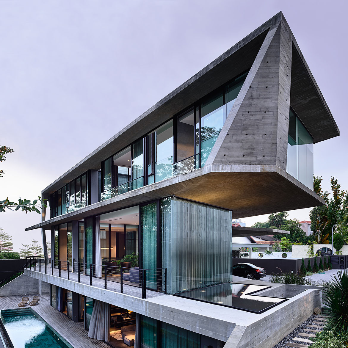 Happily, for Christina Thean, director at Park + Associates, one such owner approached her with just such a brief for their family of five. “Mr Teo’s brief to us was that they didn’t want a giant boxy house like those in the neighbourhood,” she recalls. Presenting them with an initial ground-hugging design, the owners were glad to see their ideas on scale aligned. “How did you guess we had also wanted a 2-storey house?” they asked. Composed in a horizontal sweep, the run of the residence’s upper body is perched over the entry hall with a dramatic cantilever, as if the house is poised for takeoff like the planes at Changi Airport, which is less than 1.5 kilometres from its location. A semi-basement level is tucked away from the approaching view by taking advantage of a floor-high drop in the terrain, but it is otherwise entirely open towards the greenery at the back. Elsewhere, the language is faceted and angular, making the massing more terrestrial than aerial, as if hewed tectonic plates have been playfully folded over fragile planes of ethereal glazing. The composition is simple and complete, both externally and internally, in that nothing can be added or subtracted without jarring the whole. “We wanted the architecture to be its structure, without frills,” Christina explains.