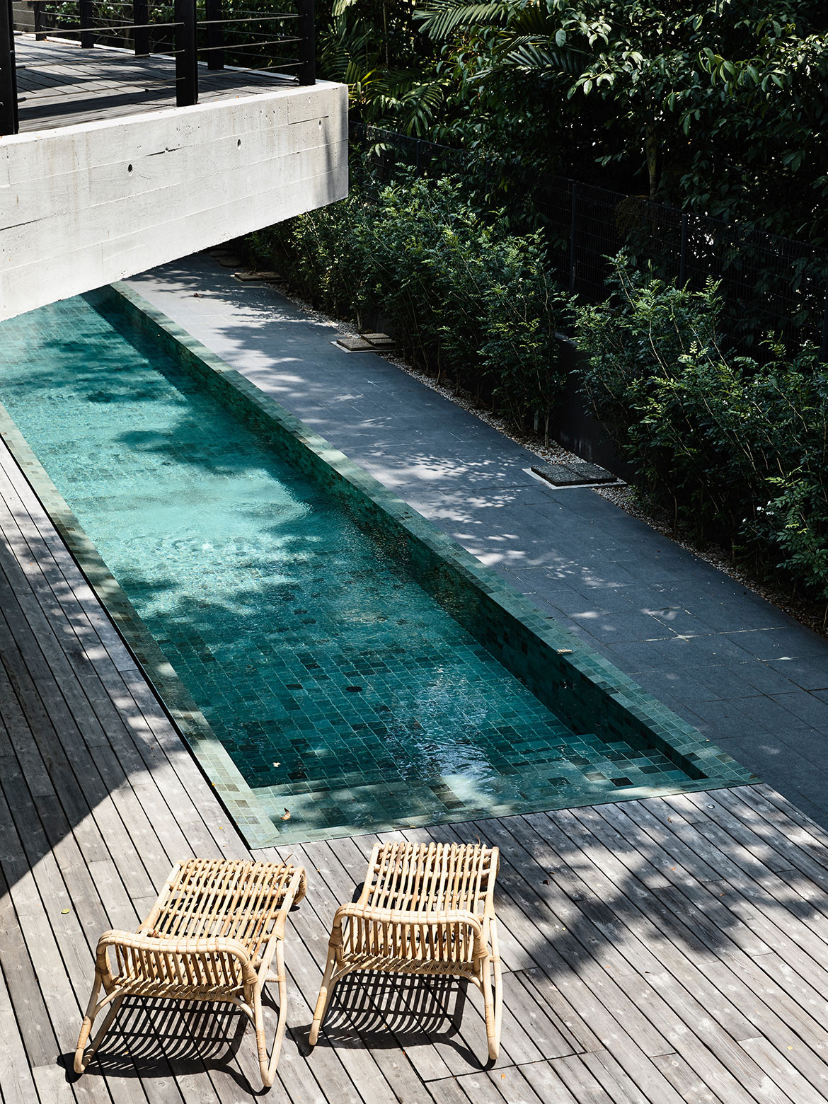 Architect and clients were also in harmony over a more austere selection of materials. The natural off-form concrete finish with timber imprints showcases the integrity of its construction – no reliance on plastering to cover up any shoddy workmanship. “We like grey and having this off-set against the Kebony timber that would also turn grey over time turned out to be a good outcome,” adds Wendy Teo, daughter of the owner. “They were also our only clients who kept asking for darker interiors,” laughs Christina, and this tonality is most apparent in the spacious family nook of the semi-basement. Here, the walls are lined with black cabinetry works, housing a good stock of books and liquor. Their neat placement in a monochromatic setting is almost an exemplary showcase for the current decluttering craze, even in this most social of spaces within the house. For it is here that entertainment can spill out to the outdoors, onto the deck of a 23-metre-long swimming pool, flanked by a luxuriant row of mature trees just beyond the porous BRC fence.