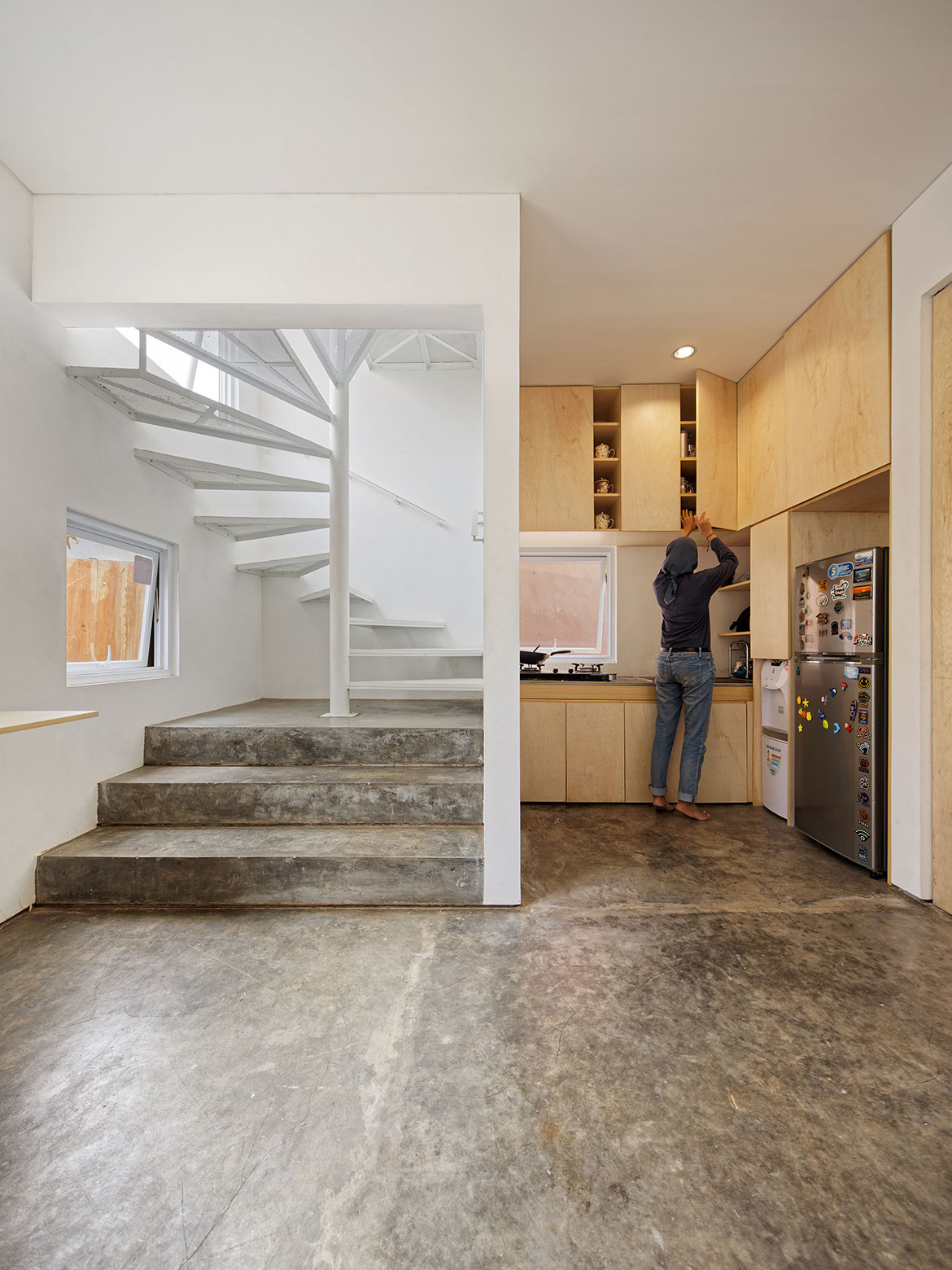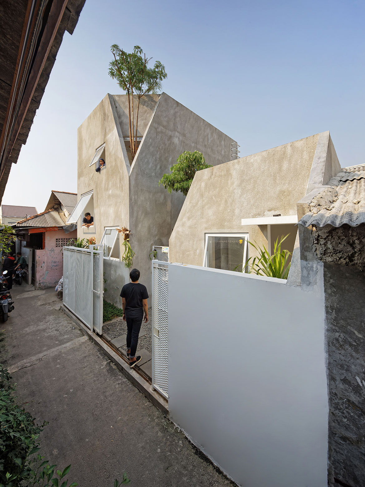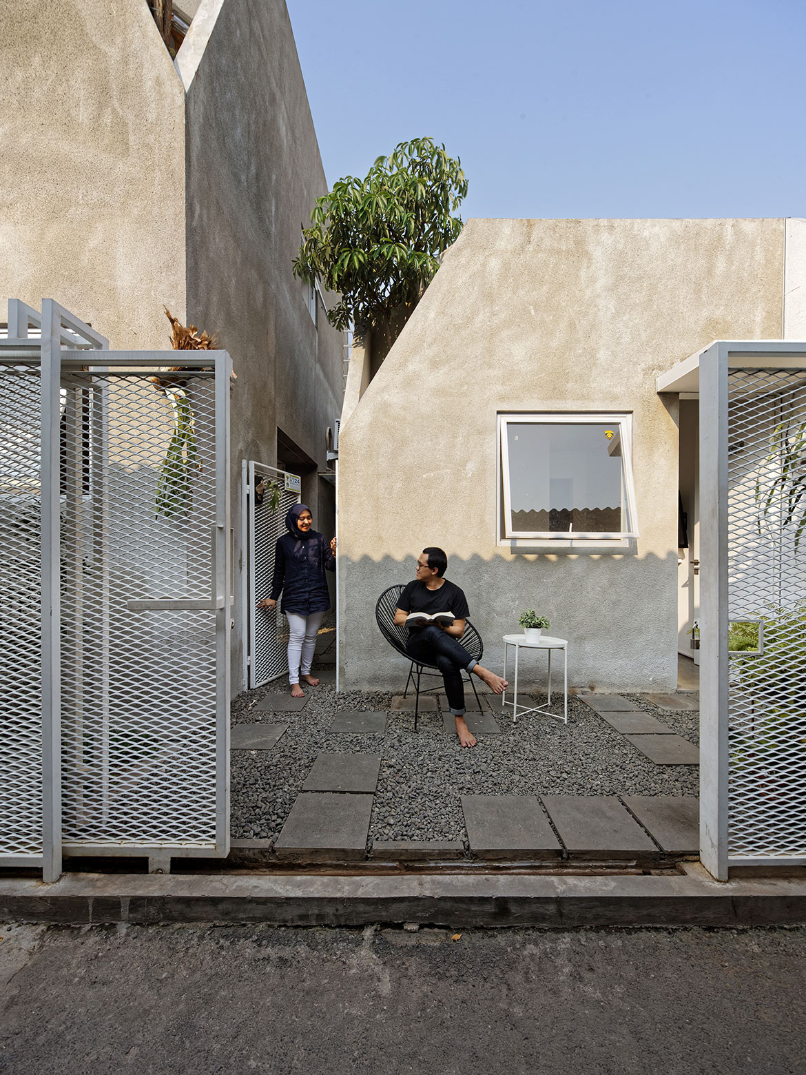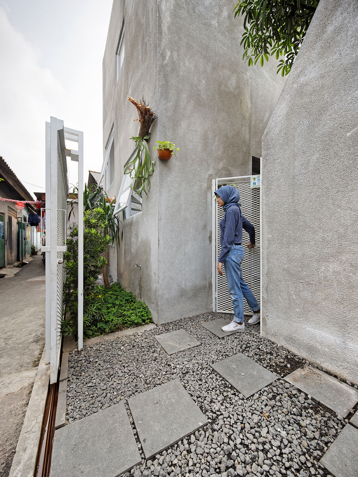 This house occupies just 73 square metres. In fact, it consists of two separate buildings, one two-storeys, the other a single level. The larger house is for a family of four, the other for a female relative. The location is a typical Jakarta rabbit warren with networks of narrow alleys linking to connecting streets. The Twins House is set in just such an alley, at 1.5 metres wide there is not enough room for cars to pass.