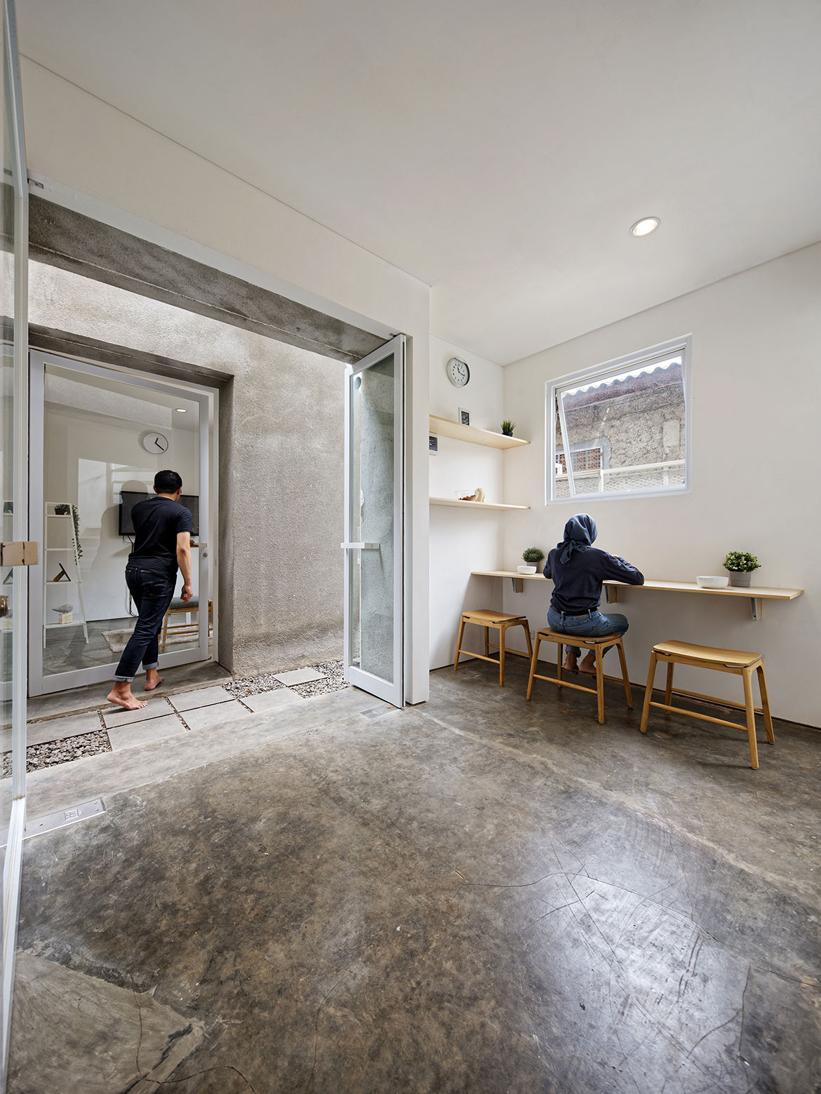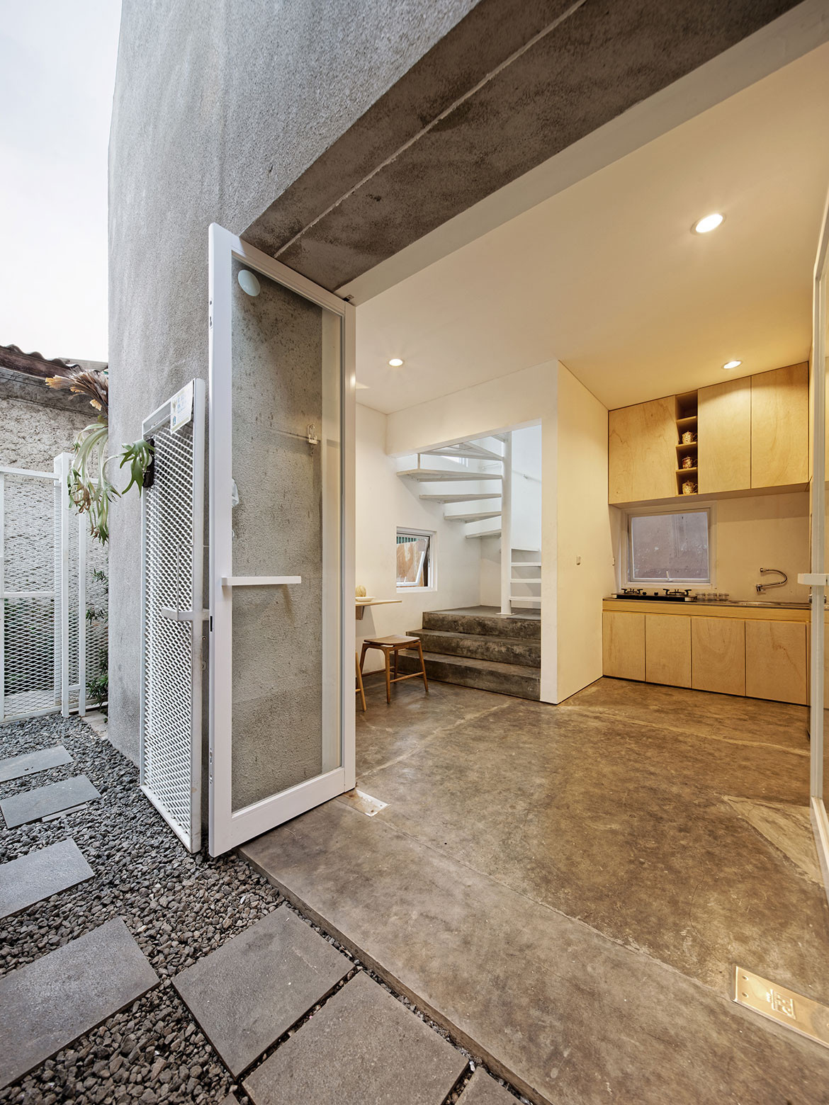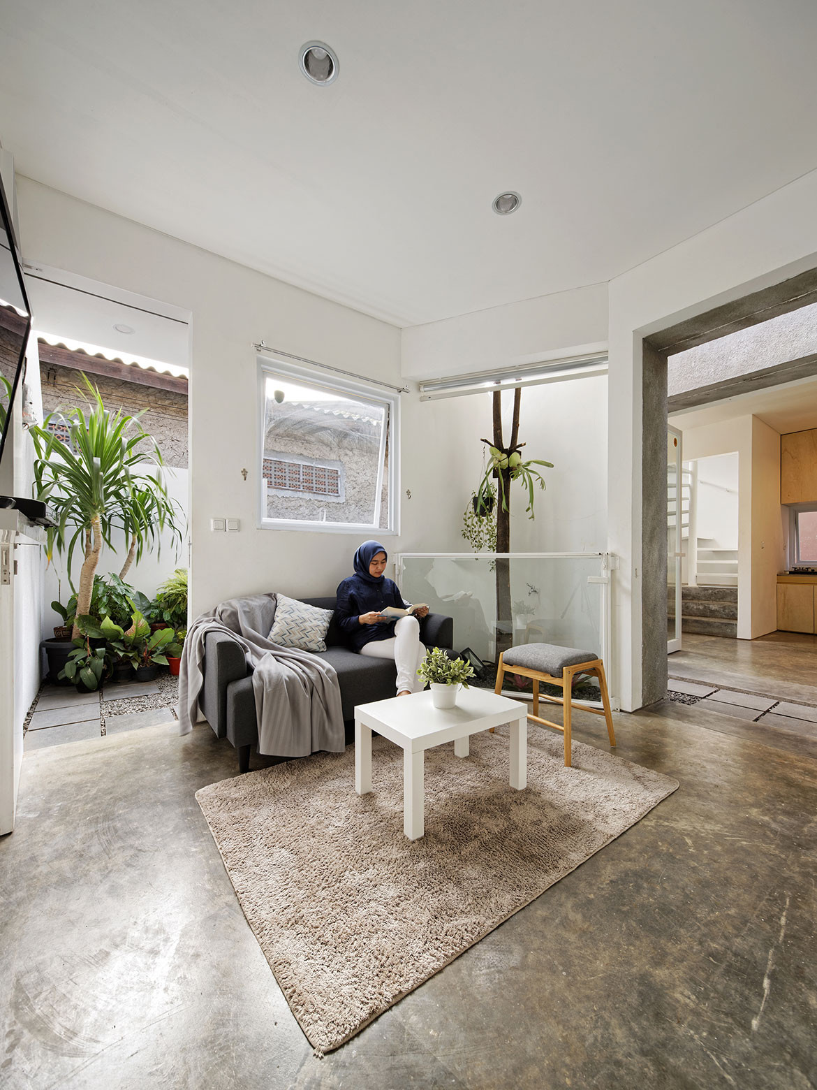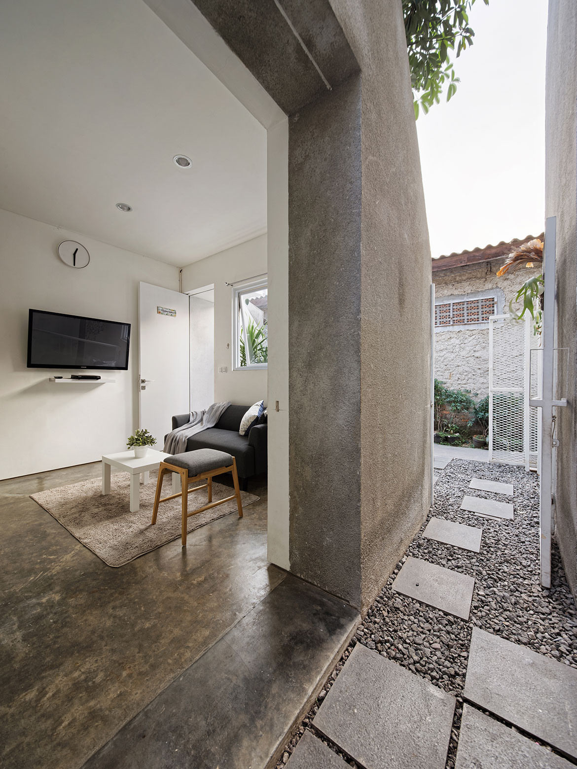 This house occupies just 73 square metres. In fact, it consists of two separate buildings, one two-storeys, the other a single level. The larger house is for a family of four, the other for a female relative. The location is a typical Jakarta rabbit warren with networks of narrow alleys linking to connecting streets. The Twins House is set in just such an alley, at 1.5 metres wide there is not enough room for cars to pass.