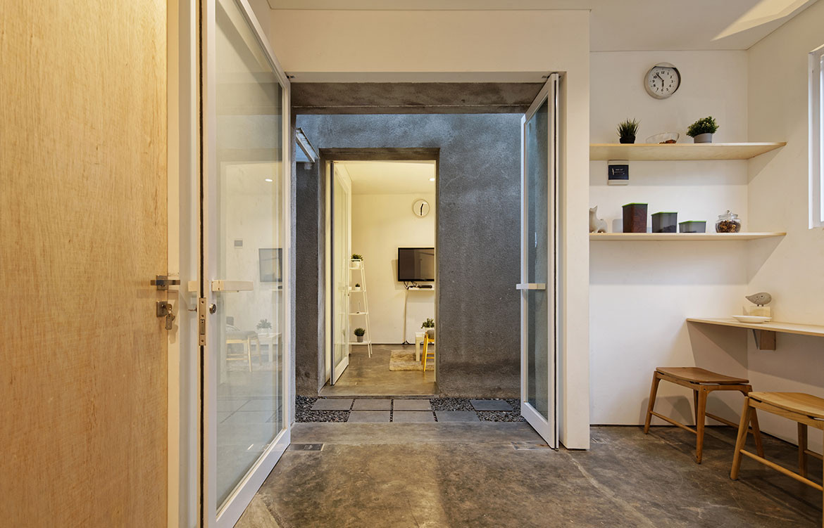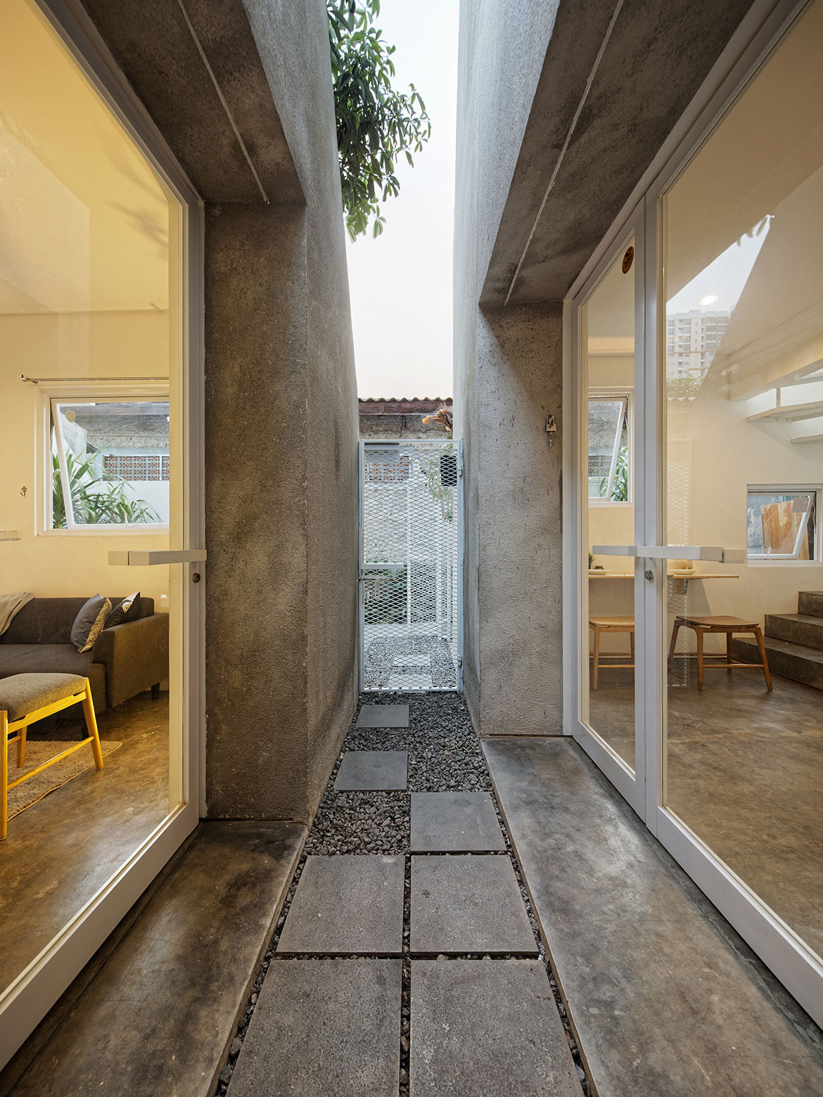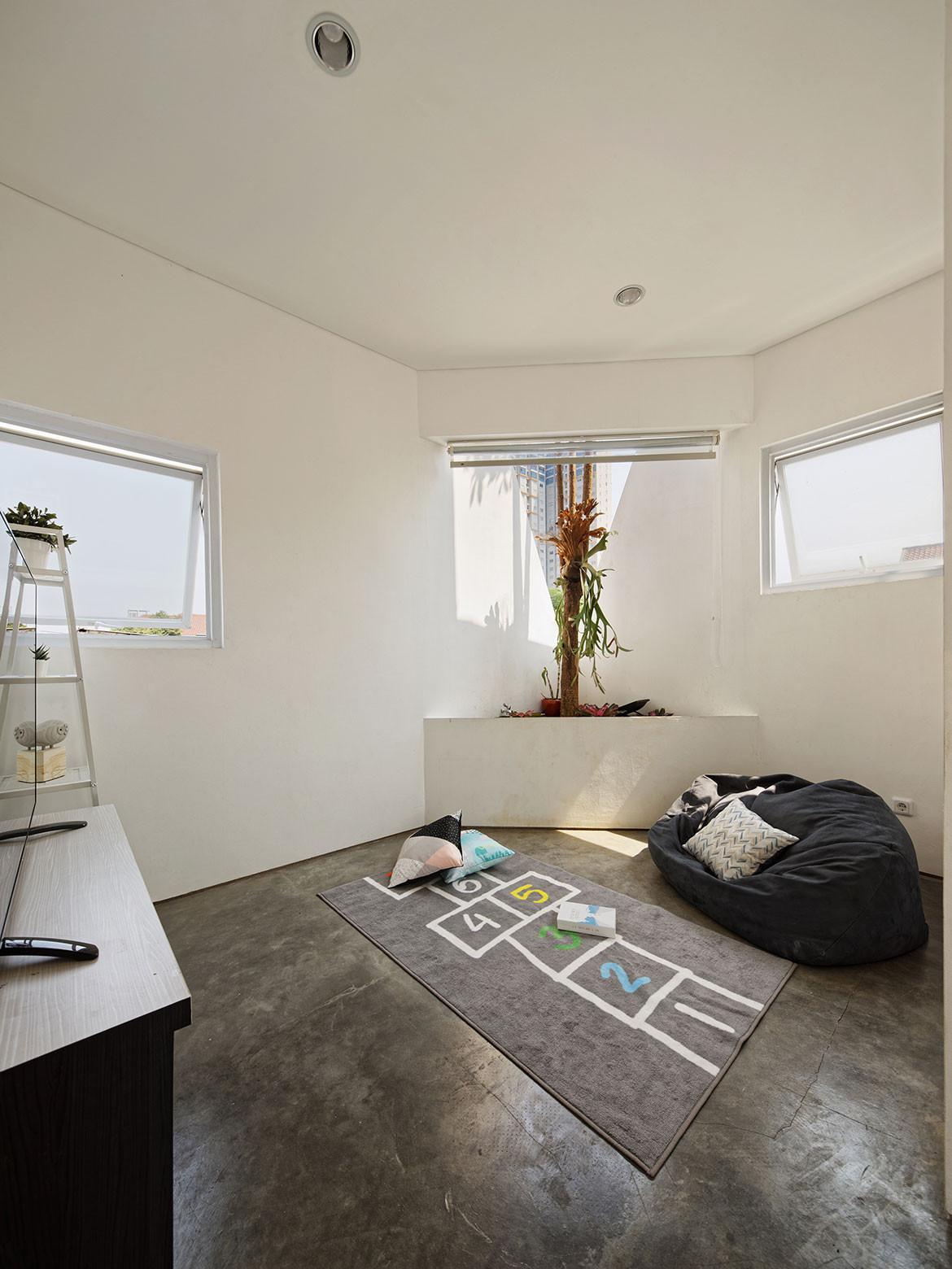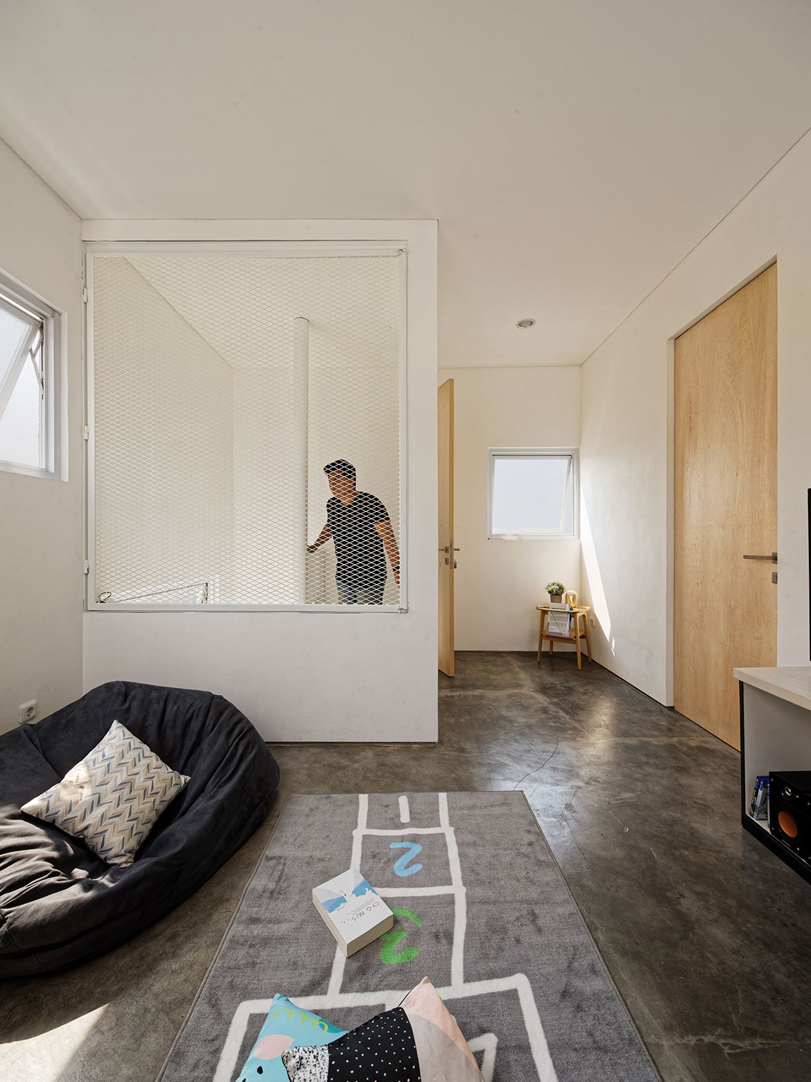 This house occupies just 73 square metres. In fact, it consists of two separate buildings, one two-storeys, the other a single level. The larger house is for a family of four, the other for a female relative. The location is a typical Jakarta rabbit warren with networks of narrow alleys linking to connecting streets. The Twins House is set in just such an alley, at 1.5 metres wide there is not enough room for cars to pass.