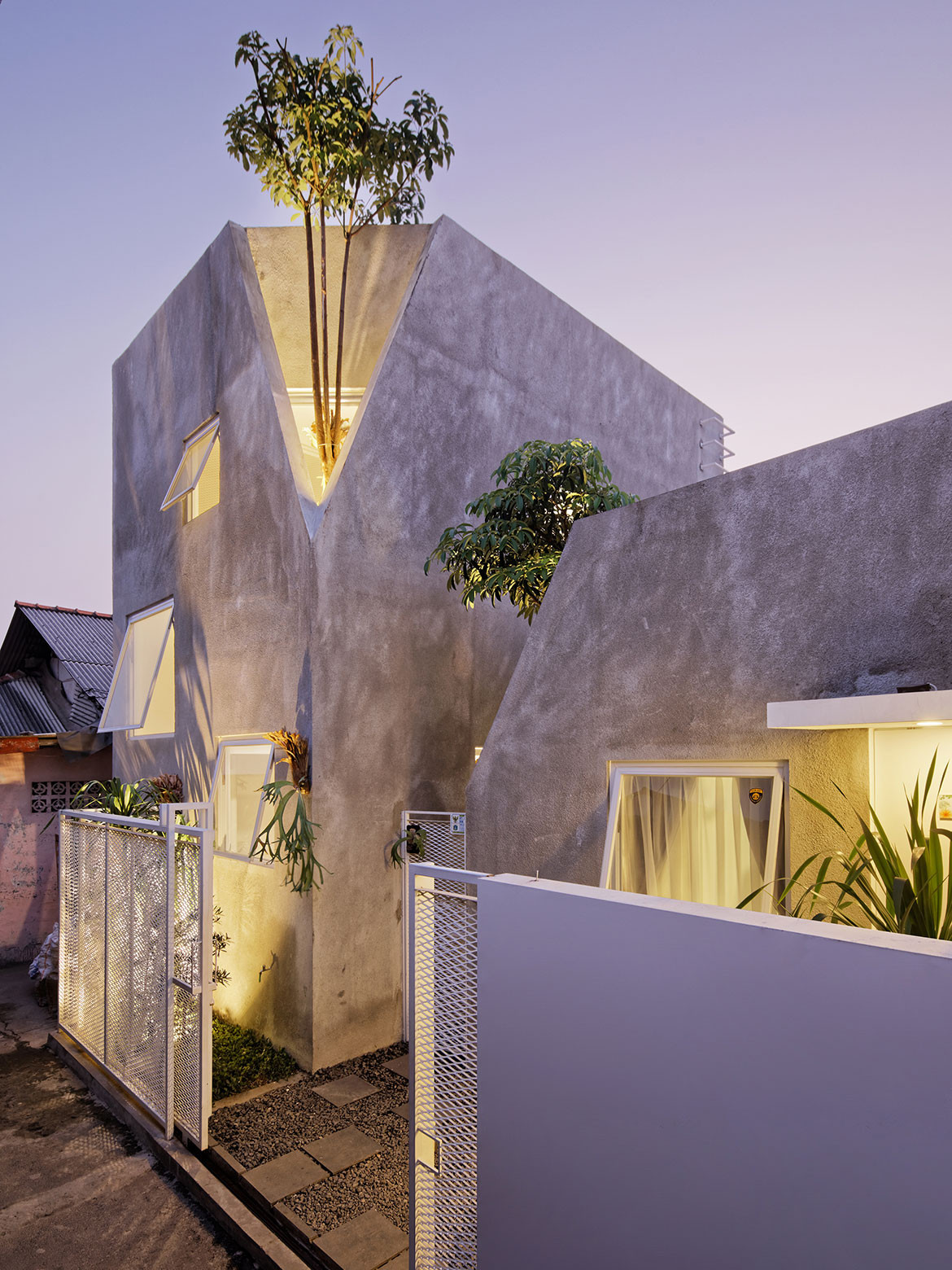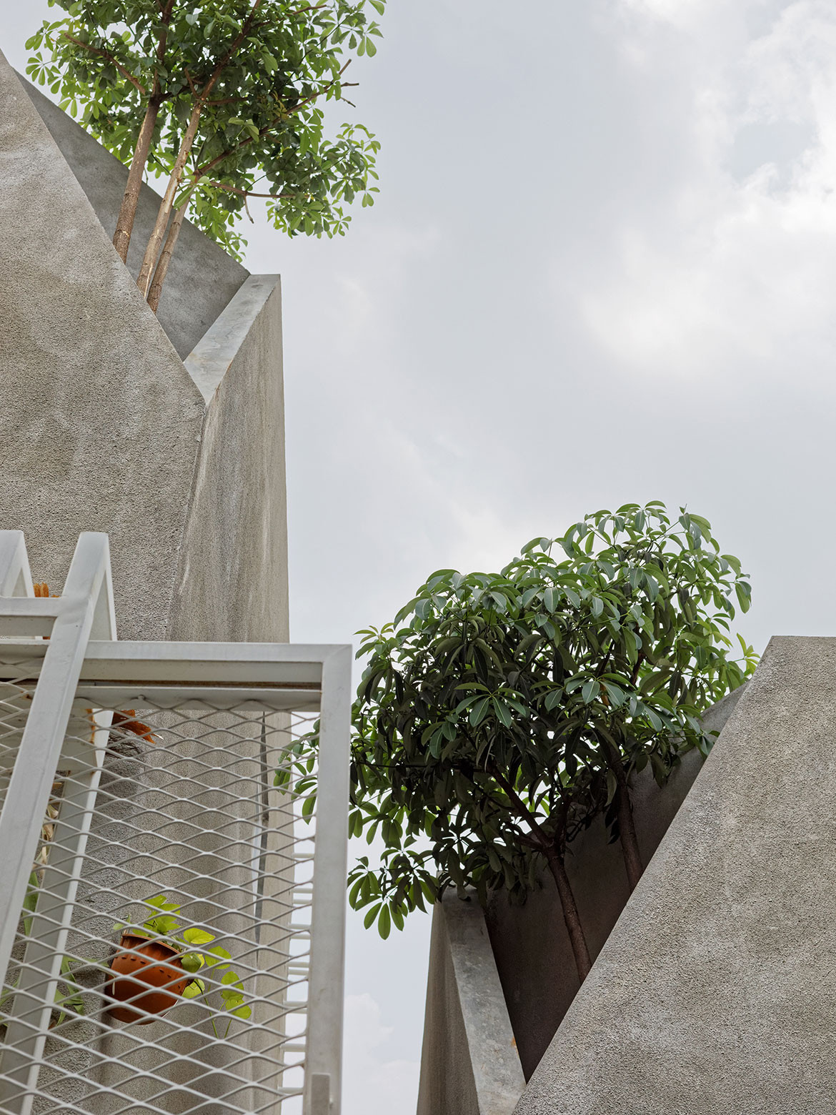 In the living space on the first floor of the larger building there is a small triangular indoor garden with a central tree growing up and out – replicated in the living room of the smaller building. The additional benefit of these sliced out apertures, open to light and rain, is that – in conjunction with the narrow passageway between the buildings – air is circulated, helping to passively cool each building.