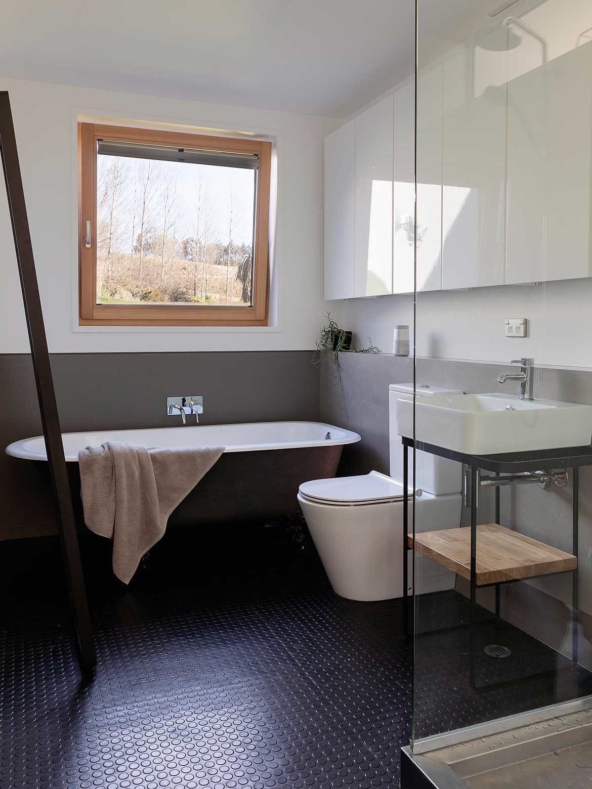 The bathroom sits off the bedroom corridor and, using “ready-mades”, the space is designed to look bespoke. The focus is on a recoated clawfoot bath sitting below a perfectly square east-facing window.