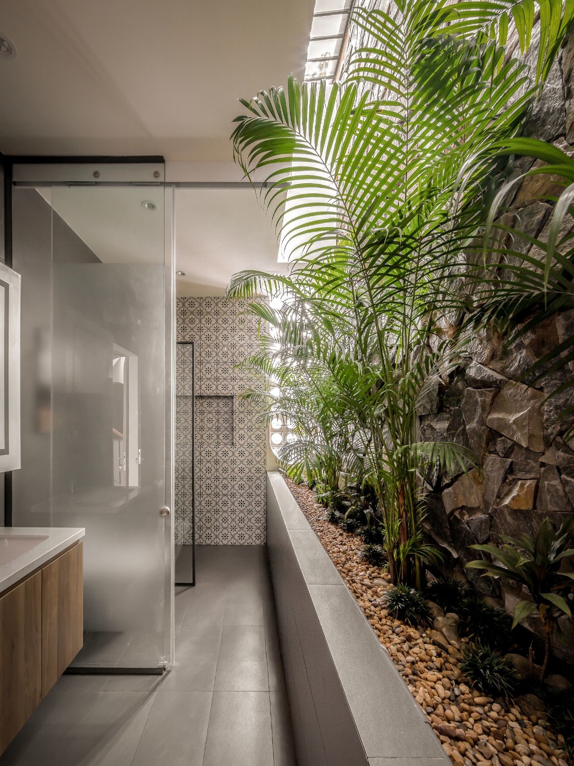 Unexpected hints of natural connection evoke calm throughout. Bathrooms are fringed by ferns in planters against a slate-like stone wall. A skylight strip above gives the experience of bathing in a lush grotto surrounded by glistening water.