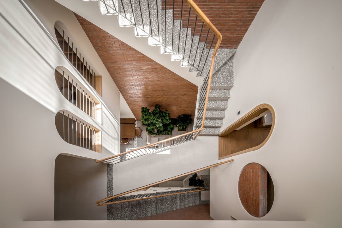On upper floors, arched doorways lead to mezzanines, interior walkways and stairways that frame the atrium. Dappled light from petite square and circular wall details enlivens these interstitial spaces, where the journey is as important as the destination.