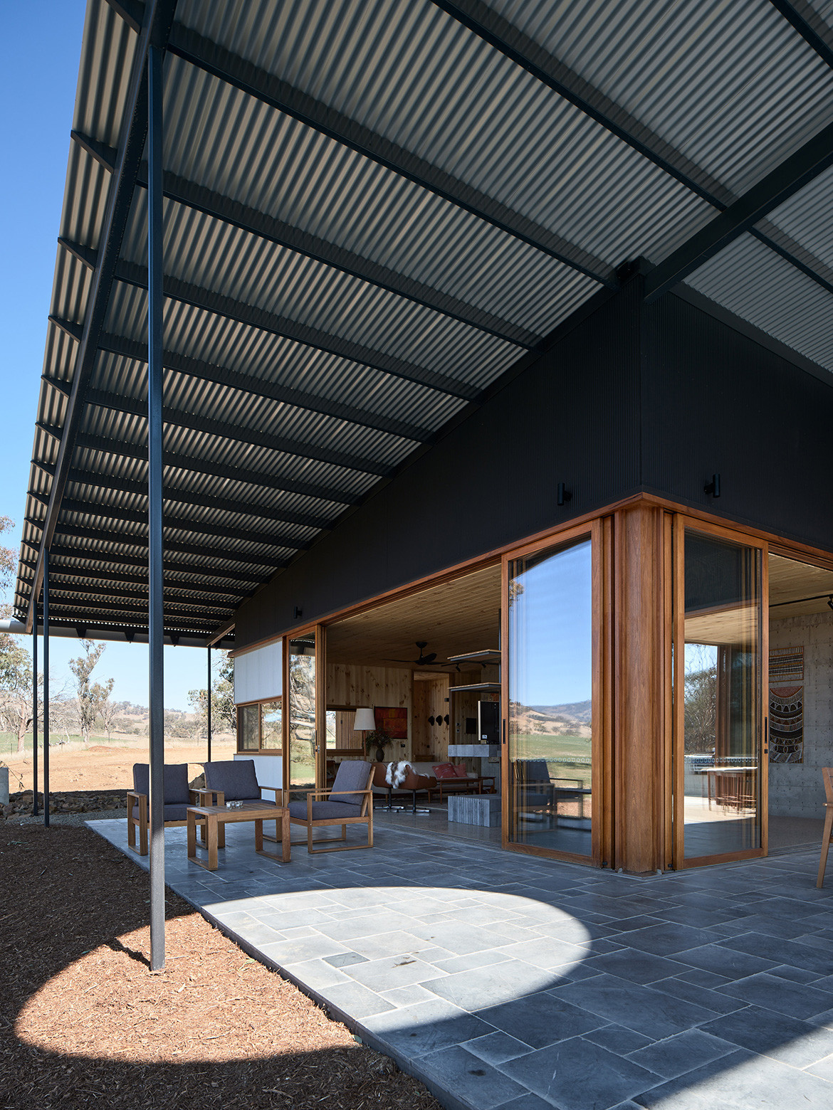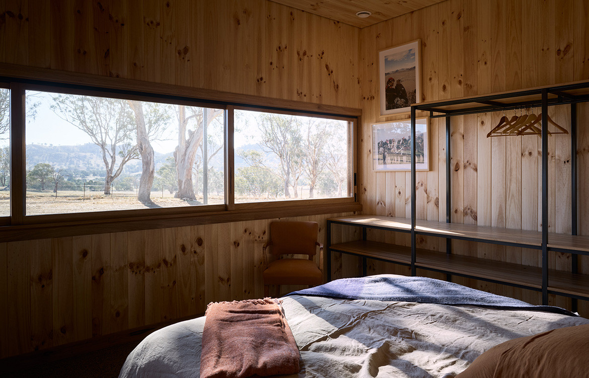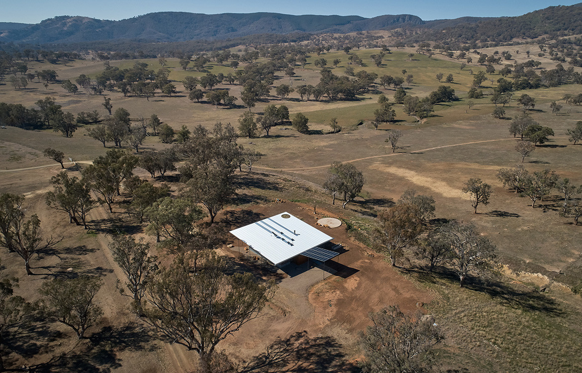 The residents of the Upside Down Akubra House came to architect Alexander Symes with a relatively comprehensive brief. They owned a 314-hectare bull farm outside Nundle (50 kilometres south east of Tamworth) and had already selected the spot on which the house was to reside. At the crest of a gentle hill the clients wanted to capture the views in literally all directions: Yella Rock to the south, Hanging Rock to the east, views north through a grove of Eucalypts and west over the bull paddocks to the rolling hills that follow. “Essentially an amazing 360-degree view all the way around,” says Alexander. But it wasn’t that simple: given its remoteness, it also needed to be completely off-grid.
