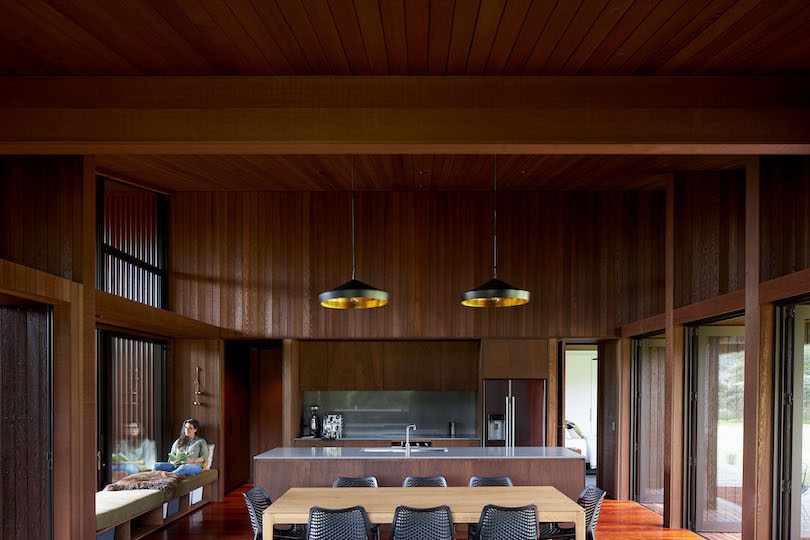 Volumes are refined and elegant in their simplicity, inspired by a small corrugated shed on the farm across the river. Adopting a similar low-pitched roof and humble iron cladding, the architects have added timber detailing, decks and landscaping to develop a sophisticated yet pared-back aesthetic. It doesn’t shout. It’s a quiet, clever house that is much larger on the inside than it looks on the outside.