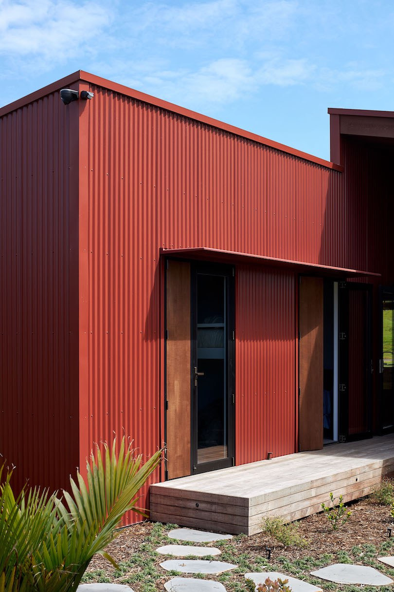 Living areas are located to the north and clad in dark-stained cedar. Bedrooms are located to the south – a retreat in the heat of the day – and covered in a rich scoria-red corrugate. The red is a reference to multiple strands of cultural heritage: painted Māori carvings and whare, the iconic red barn, the rusty colours of volcanic scoria.