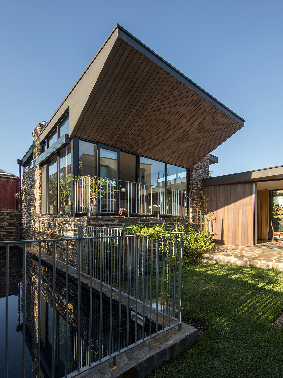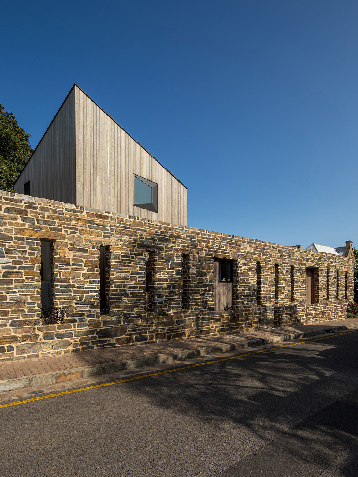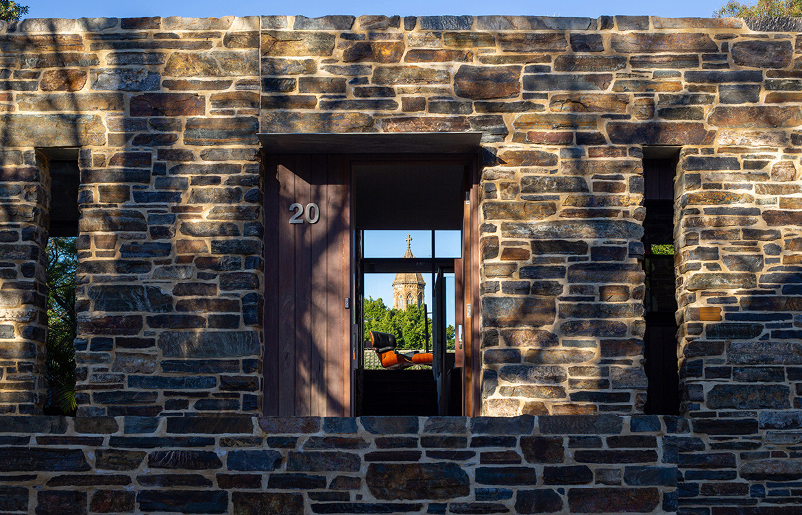 To provide privacy from that passing traffic, and protection from the hot afternoon sun along the western elevation, Nathan shielded the house with a stone wall made of locally quarried Bluestone, a material that is plentiful throughout the suburb. Apertures in the wall provide views into and out of the house, and one of them looks straight through the house to frame a view of the nearby St Peters Cathedral.