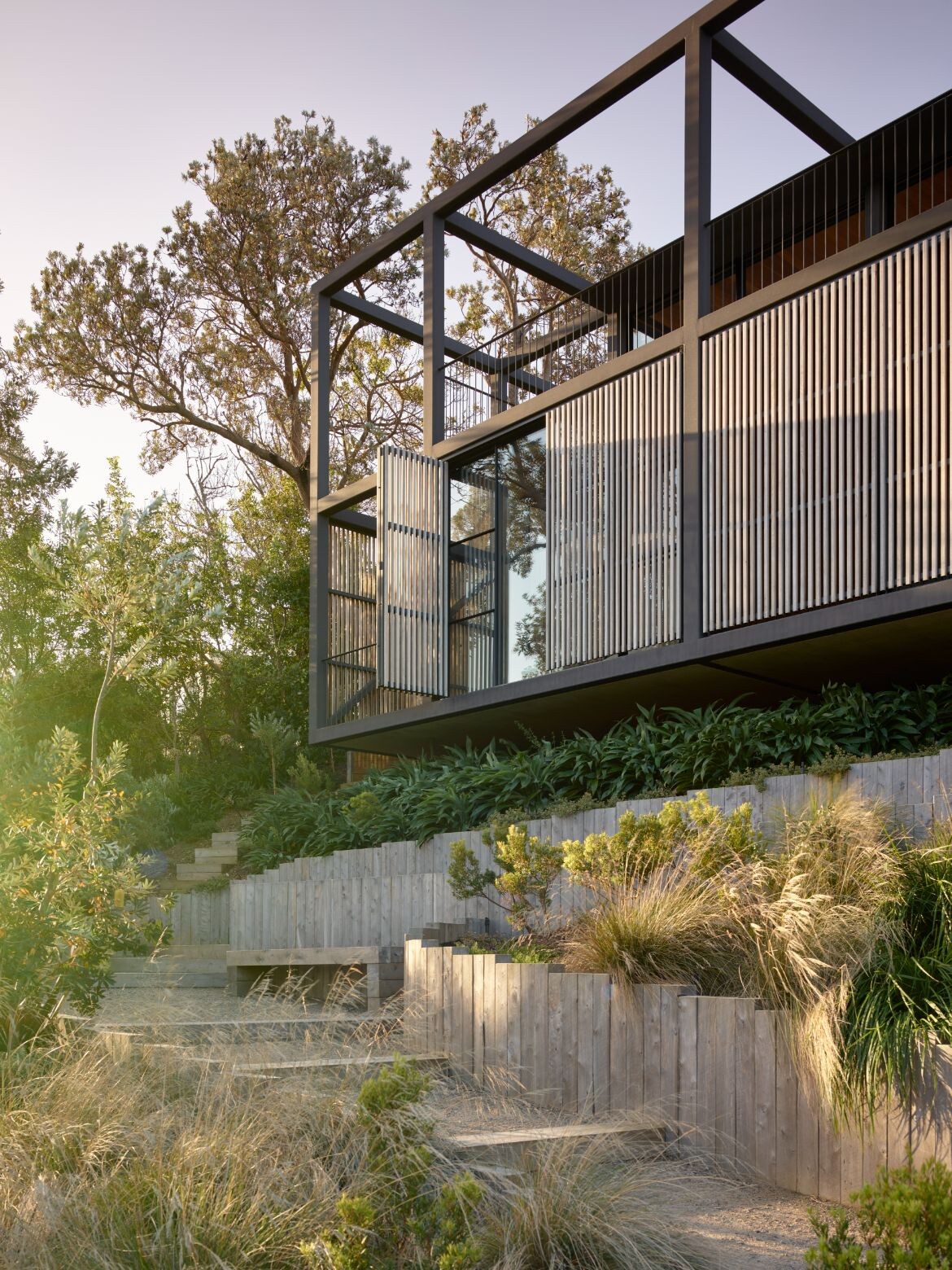 The main home is designed over two levels with a series of stairs on one side that either lead to the front door (on the first level) or to rooms below, this skeletal steel and timber-framed portico allow the elements to be experienced at all times of the year.
