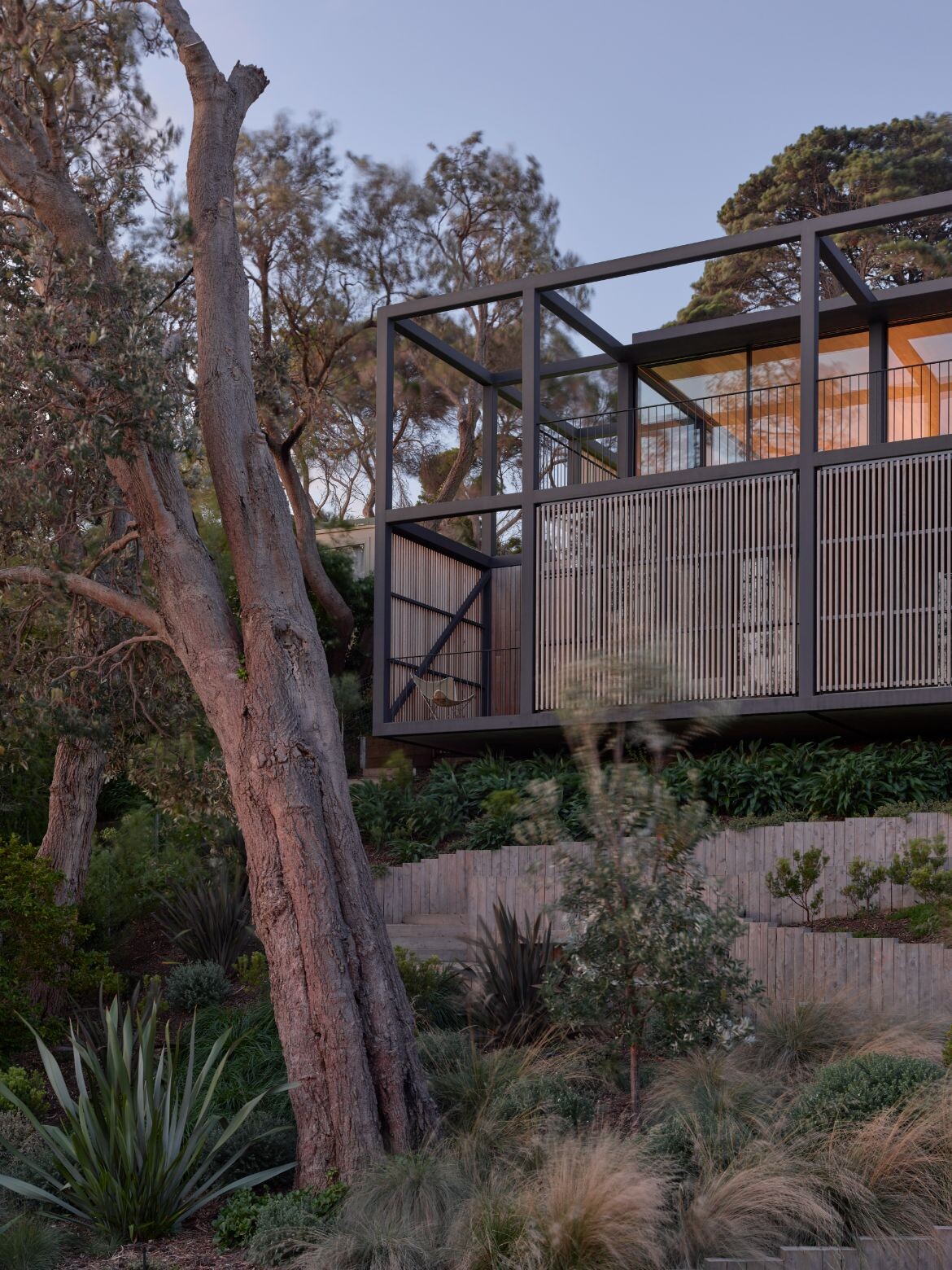 While the steep site and water views helped shape this two-level, timber-clad, expressed steel-framed house, it was the creation of a new timber pavilion adjacent to the beach that formed a maquette for the design of the main building.