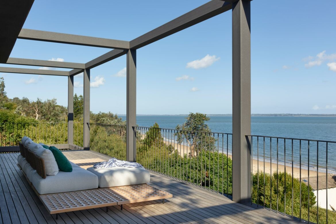 Located on a steep site, with a fall of approximately 10 metres, the views of Westernport Bay can be enjoyed across the flat roofline of Somers Beach House. Accessed via a cul-de-sac bordering a reserve, it’s an idyllic escape for the owners, their children and grandchildren.