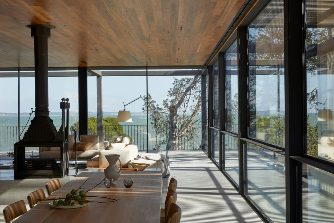 He was mindful of creating an efficient house when it came to the use of heating or cooling. When the summer heat puts out its sting, operable timber-battened screens can conceal the large picture windows.