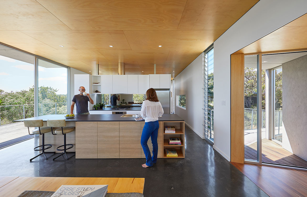 The interior is calm and neutral with white walls and Hoop Pine ceiling to draw focus to the natural landscape. The walls stop short of the ceiling and there are no internal doors in order to enhance the visual flow and amplify the sense of a singular open space. Eaves extend beyond the glass walls of the house, like the awning of a tent, to block summer sun while allowing winter rays to warm the charcoal-pigmented floor slab.