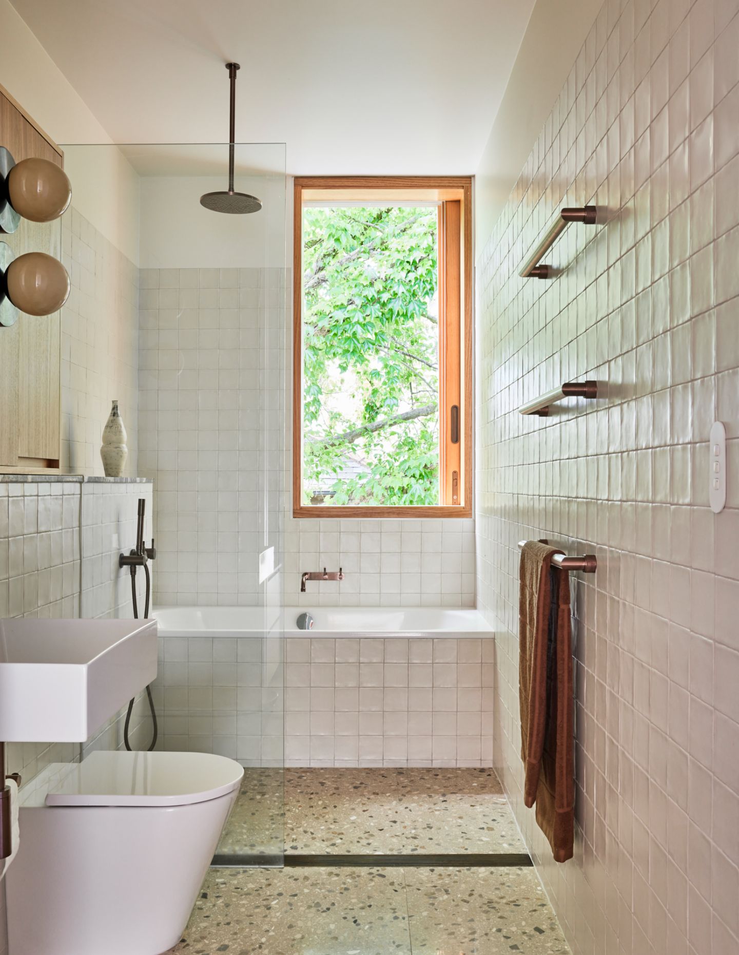 A light, airy pavilion is rhythmically expressed in Victorian ash. Within, a double-height void opens up the living space to sunlight and air, deepening the links between the private upstairs spaces and the downstairs spots in which the family comes together. A fireplace divides the open-plan living, kitchen, and dining spaces, which flow serenely onto the east-facing deck covered by a wisteria-clad pergola that frames the garden view. It is a home perfectly suited to entertaining and elevating the simple daily ritual of a meal in the sun.